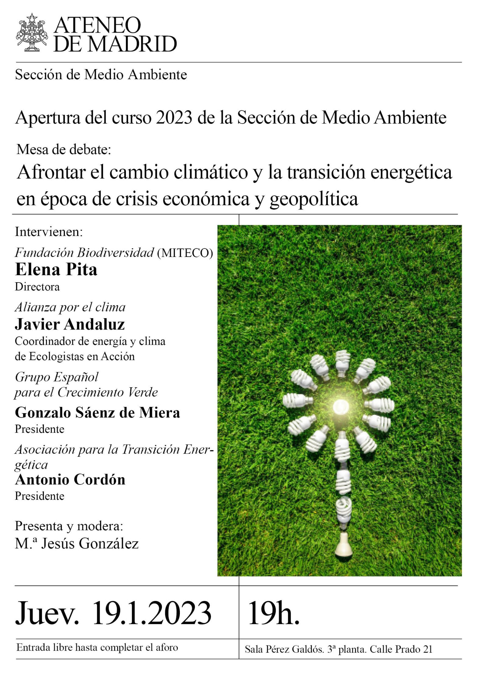 Apertura del curso 2023 de la sección de Medio Ambiente del Ateneo de Madrid. Mesa de debate: Afrontar el cambio climático y la transición energética en época de crisis económica y geopolítica. Intervienen: Fundación Biodiversidad: Elena Pita, directora. Alianza por el clima: Javier Andaluz, coordinador de energía y clima de Ecologistas en Acción. Grupo Español para el Crecimiento Verde: Gonzalo Saenz de Miera, presidente. Asociación para la Transición Energética: Antonio Cordón, presidente. Presenta y modera: M.ª Jesús González. Sala Pérez Galdós.