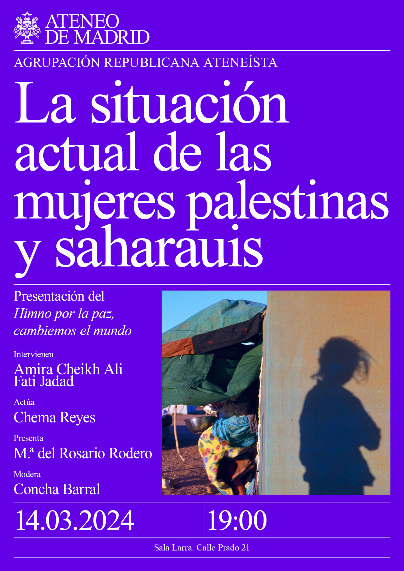Agrupación Republicana Ateneísta. Intervienen: Amira Cheikh Ali, abogada palestina y Fati Jadad, graduada en Administración y Dirección de Empresas saharaui. Actúa: Chema Reyes. Presenta: M.ª del Rosario Rodero. Modera: Concha Barral. Sala Larra. 19:00h.