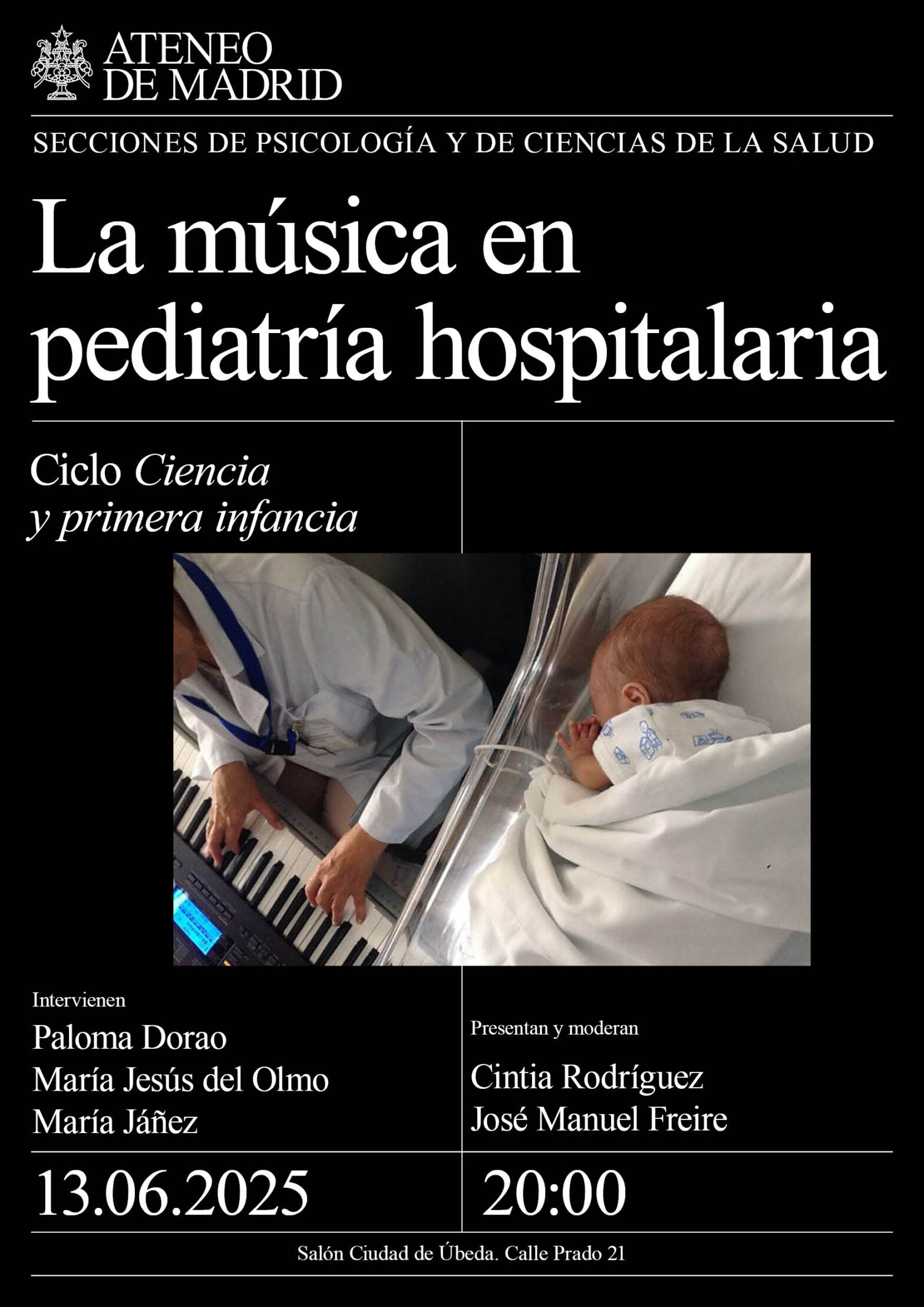 Secciones de Psicología y de Ciencias de la Salud. Intervienen: Paloma Dorao, jefa de Servicio de Cuidados Intensivos Pediátricos del Hospital La Paz; María Jesús del Olmo, profesora de Música de la Universidad Autónoma de Madrid; y María Jáñez, psicóloga clínica del Hospital Infanta Leonor en Madrid. Presentan y moderan: Cintia Rodríguez y José Manuel Freire. Salón Ciudad de Úbeda. 20:00h.