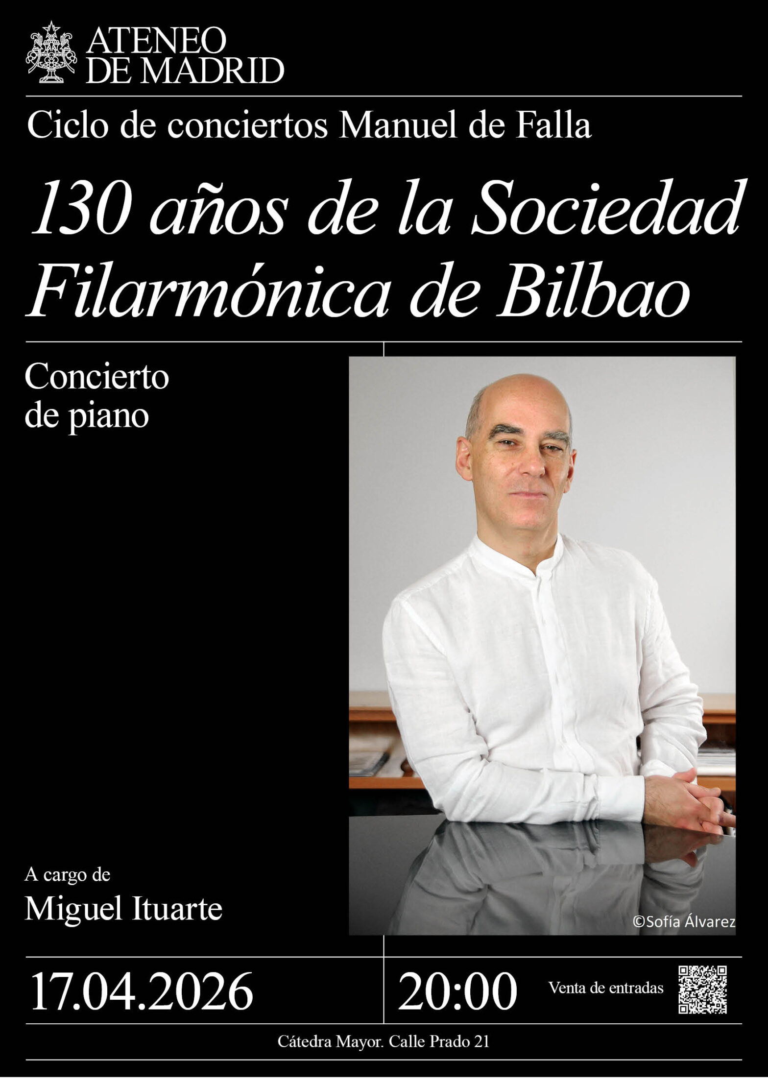 Con motivo de sus 130 años de existencia la Sociedad Filarmónica de Bilbao va a celebrar en su maravillosa sala, un concierto extraordinario de piano el martes, 28 de abril de 2026, interpretado por el pianista Miguel Ituarte.