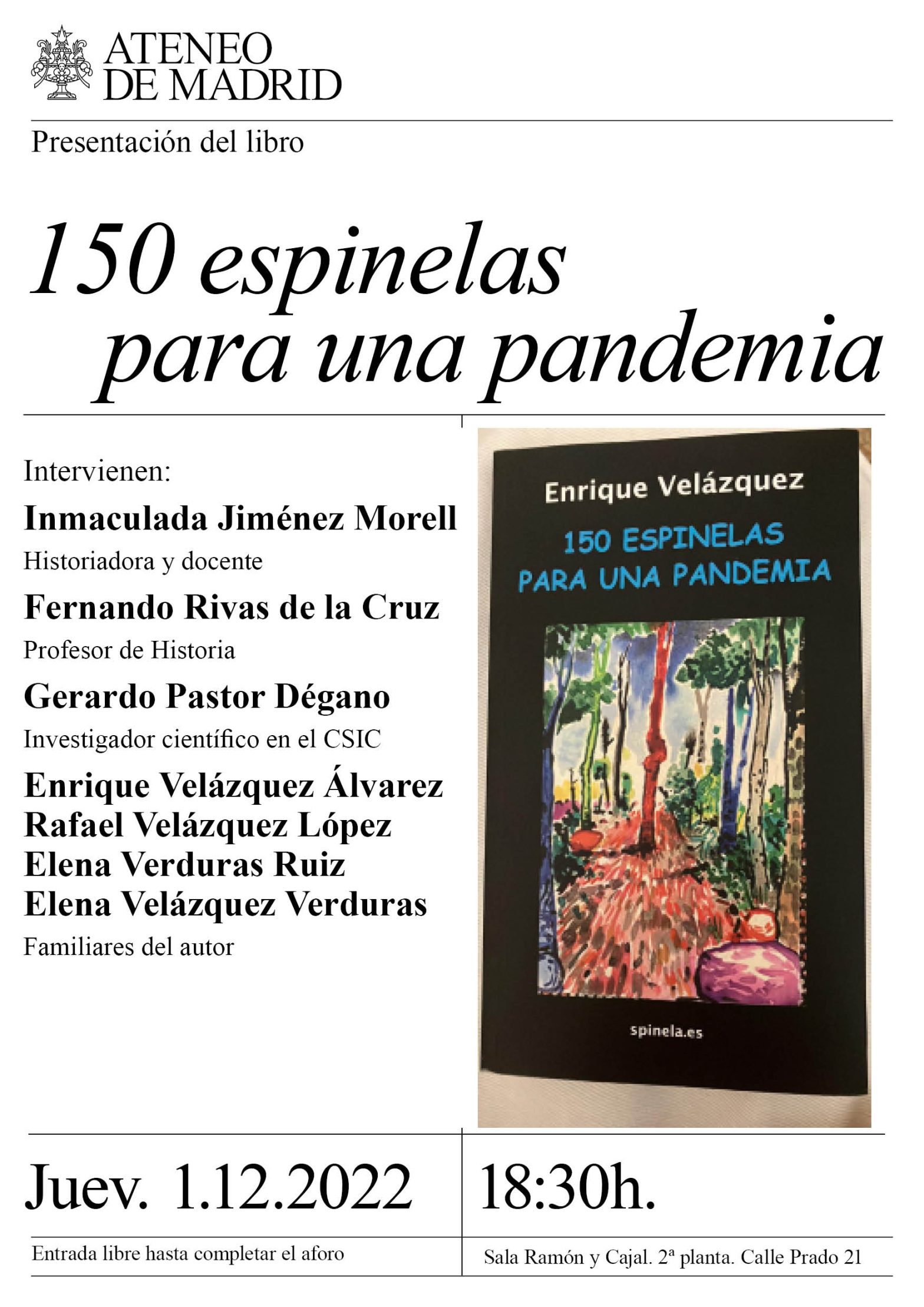 Presentación del libro 150 espinelas para una pandemia. Intervienen Inmaculada Jiménez Morell, historiadora y docente, Fernando Rivas de la Cruz , profesor de historia, Gerardo Pastor Dégano, investigador científico en el CSIC, Enrique Velázquez Álvarez, Rafael Velázquez López, Elena Verduras Ruiz, Elena Velázquez Verduras, familiares del autor. Sala Ramón y Cajal. 18.30 h.