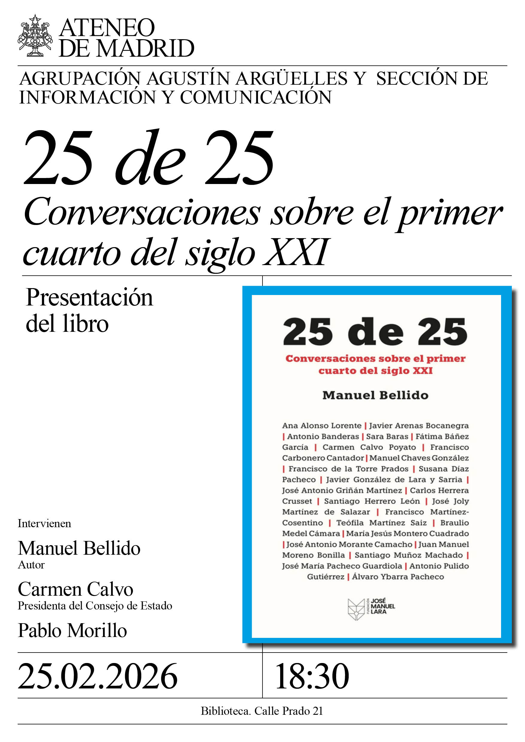 Carmen Calvo, presidenta del Consejo de Estado y Pablo Morillo, director de la Fundación José Manuel Lara. Biblioteca. 18:30h.