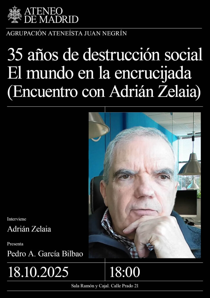 Agrupación Ateneísta Juan Negrín. Interviene: Adrián Zelaia, presidente del Centro de Investigación «EKAI». Asesor / delegado en el Comité Económico y Social Europeo, Comisión Consultiva sobre el Cambio Industrial (CCMI). Presenta: Pedro A. García Bilbao. Sala Ramón y Cajal. 18:00h.