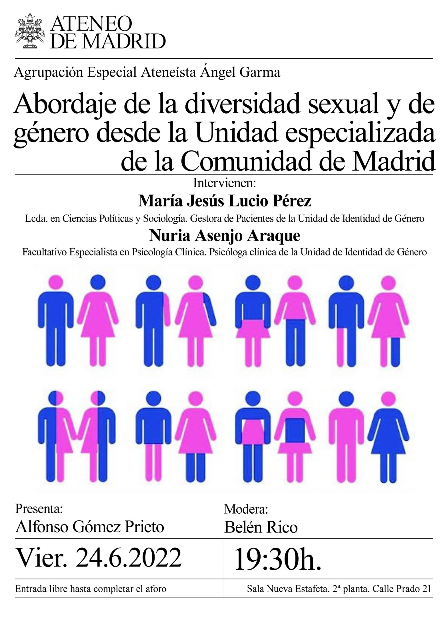 Agrupación Especial Ateneísta Ángel Garma. Intervienen:  María Jesús Lucio Pérez, licenciada en Ciencias Políticas y Sociología, gestora de Pacientes de la Unidad de Identidad de Género,  Nuria Asenjo Araque, facultativa especialista en Psicología Clínica de la Unidad de Identidad de Género. Presenta Alfonso Gómez Prieto. Modera Belén Rico. Sala Nueva Estafeta. 19.30 h.
