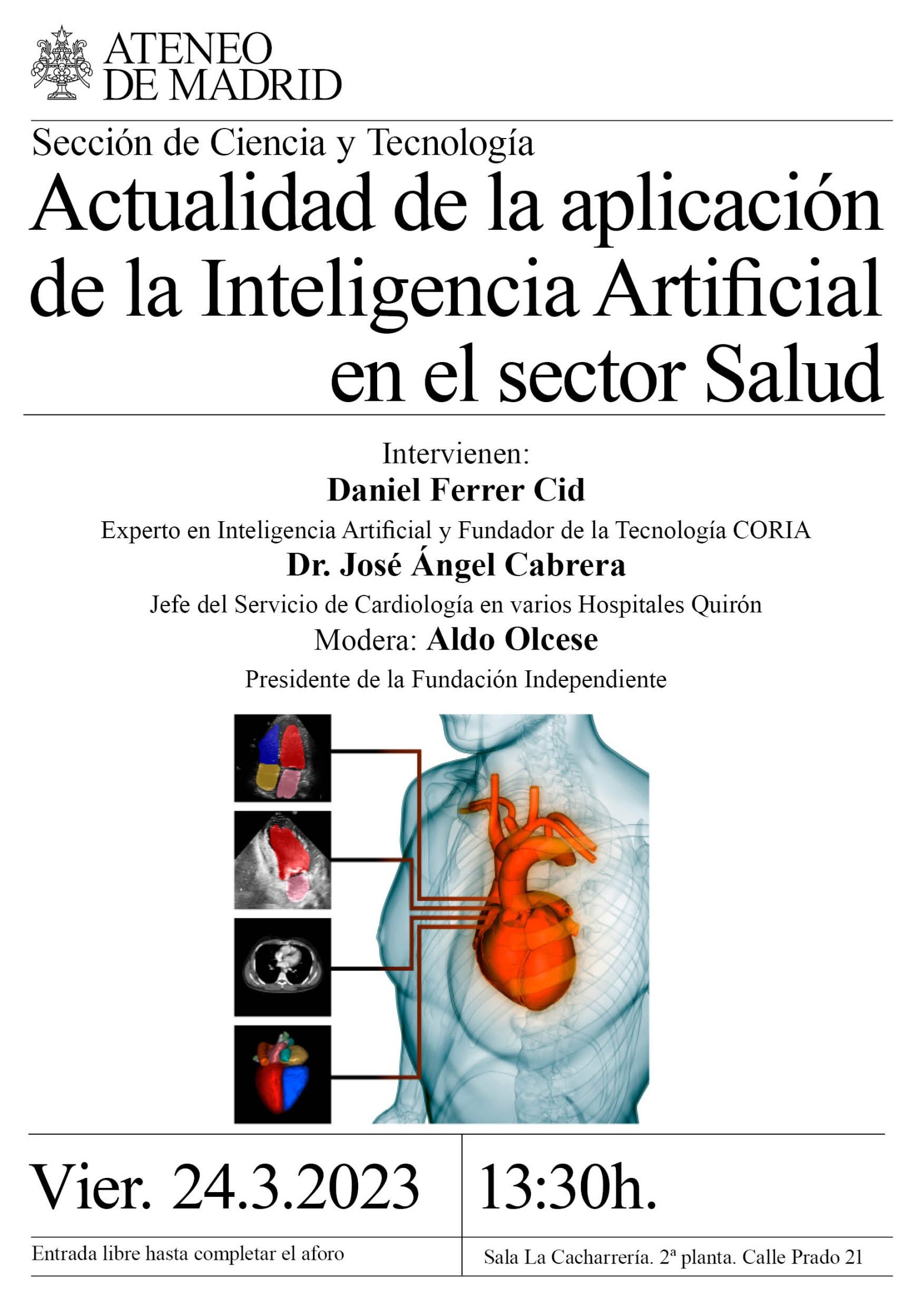 Sección de Ciencia y Tecnología. Intervienen: Daniel Ferrer Cid. Experto en Inteligencia Artificial y Fundador de la Tecnología CORIA. Dr. José Ángel Cabrera. Jefe del Servicio de Cardiología en varios Hospitales Quirón. Aldo Olcese. Presidente de la Fundación Independiente. Sala La Cacharrería. 13:30h.