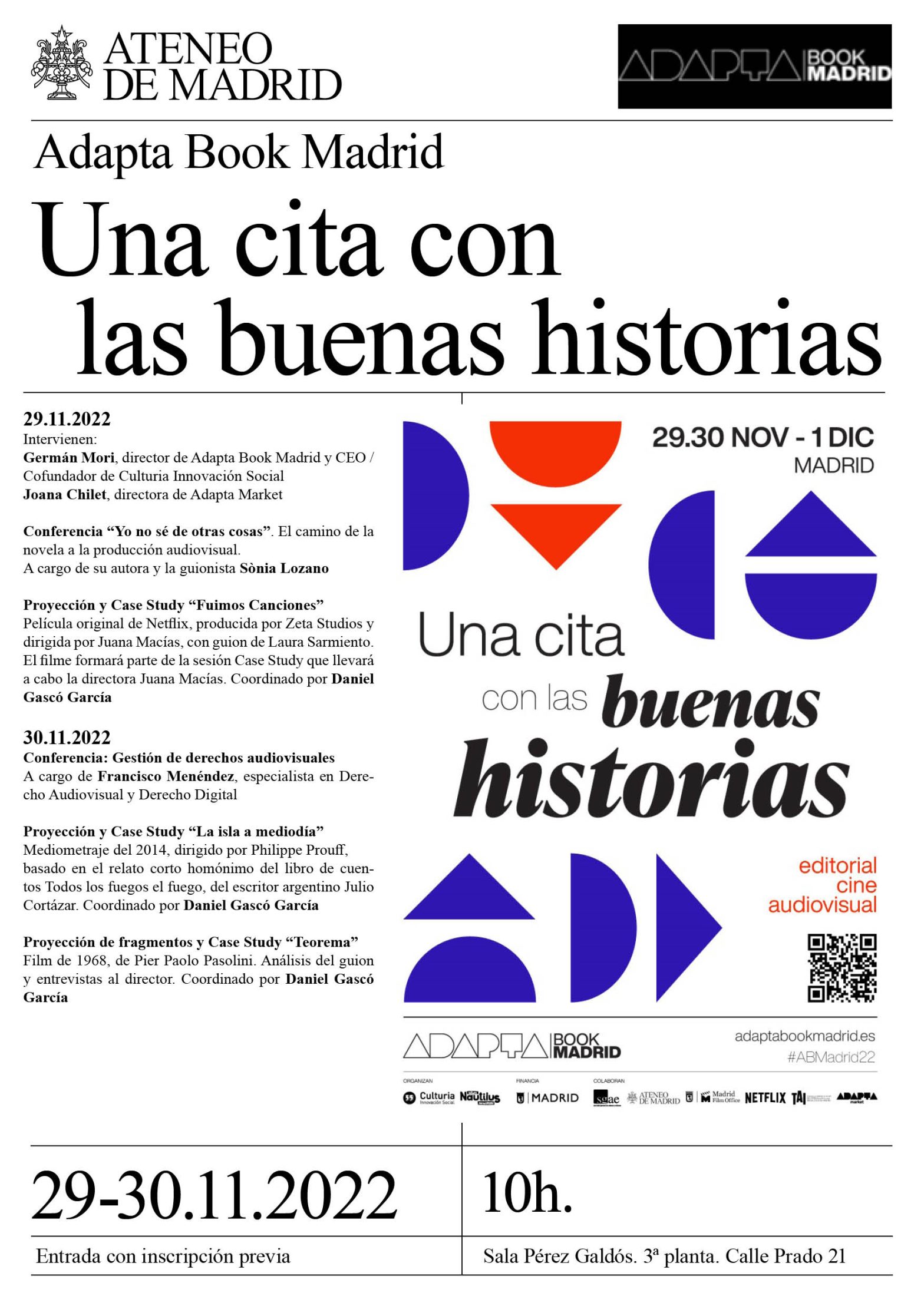 Adapta book Madrid, En este enlace puedes encontrar la programación. Las actividades son gratuitas y solo requieren inscripción previa: https://adaptabookmadrid.es/formulario-de-inscripcion/