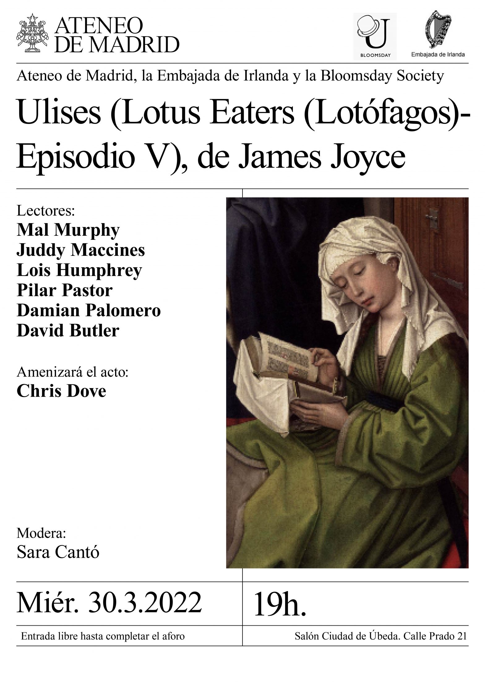 Bloomsday Society. Lectores: Mal Murphy, Juddy Maccines, Lois Humphrey, Pilar Pastor, Damian Palomero, David Butler. Chris Dove, amenizará el acto. Modera: Sara Cantó. Salón Ciudad de Úbeda.