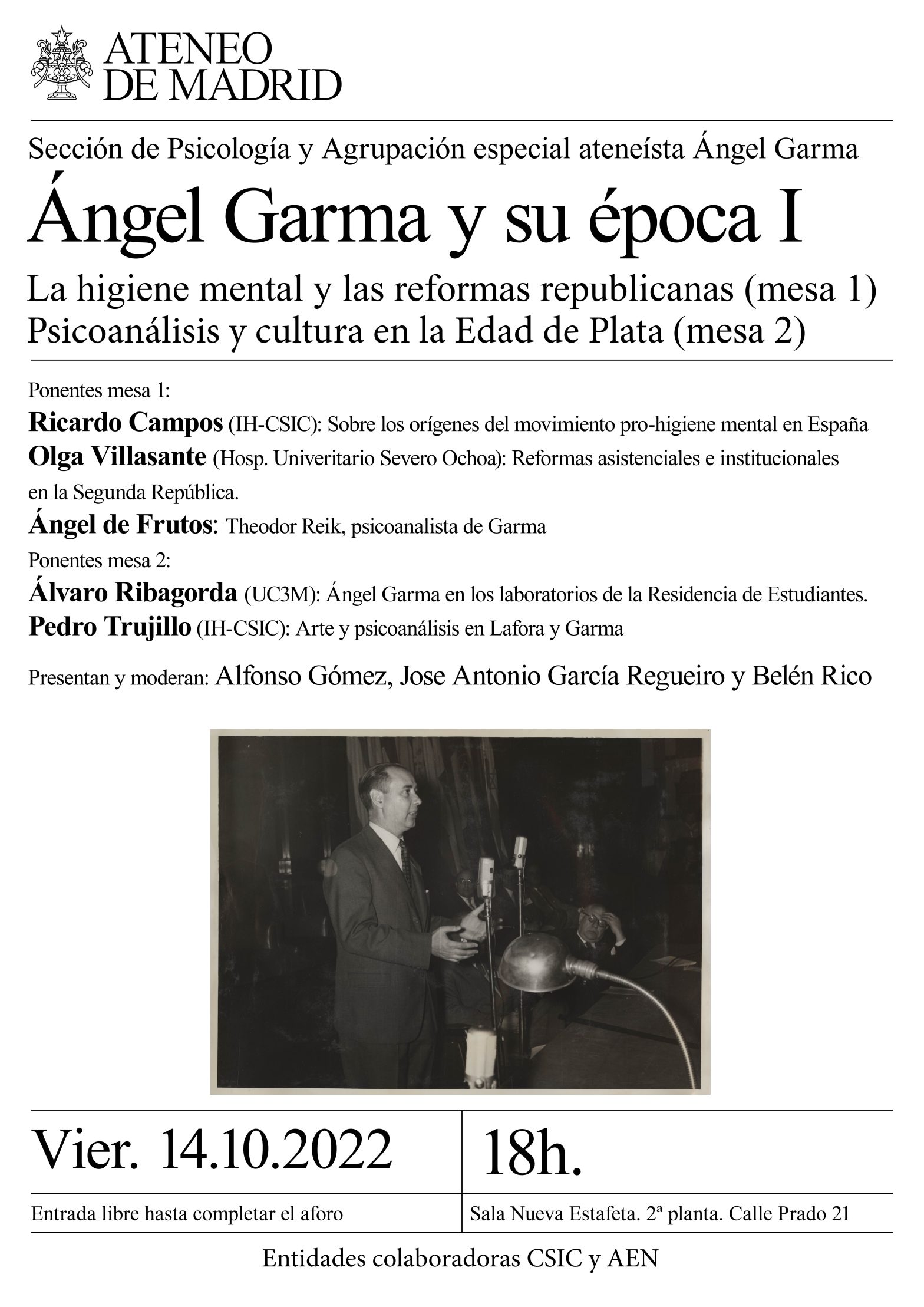 Sección de Psicología y Agrupación especial Ateneísta Ángel Garma. Intervienen: Ricardo Campos (IH-CSIC): Sobre los orígenes del movimiento pro-higiene mental en España. Olga Villasante (Hosp.Univeritario Severo Ochoa): Reformas asistenciales e institucionales en la Segunda República, Ángel de Frutos: Theodor Reik, psicoanalista de Garma. Mesa 2: Psicoanálisis y cultura en la Edad de Plata. Intervienen: Álvaro Ribagorda (UC3M): Ángel Garma en los laboratorios de la Residencia de Estudiantes, Pedro Trujillo (IH-CSIC): Arte y psicoanálisis en Lafora y Garma. Presenta y modera: Alfonso Gómez, Jose Antonio García Regueiro y Belén Rico. Sala Nueva Estafeta. 18 h.