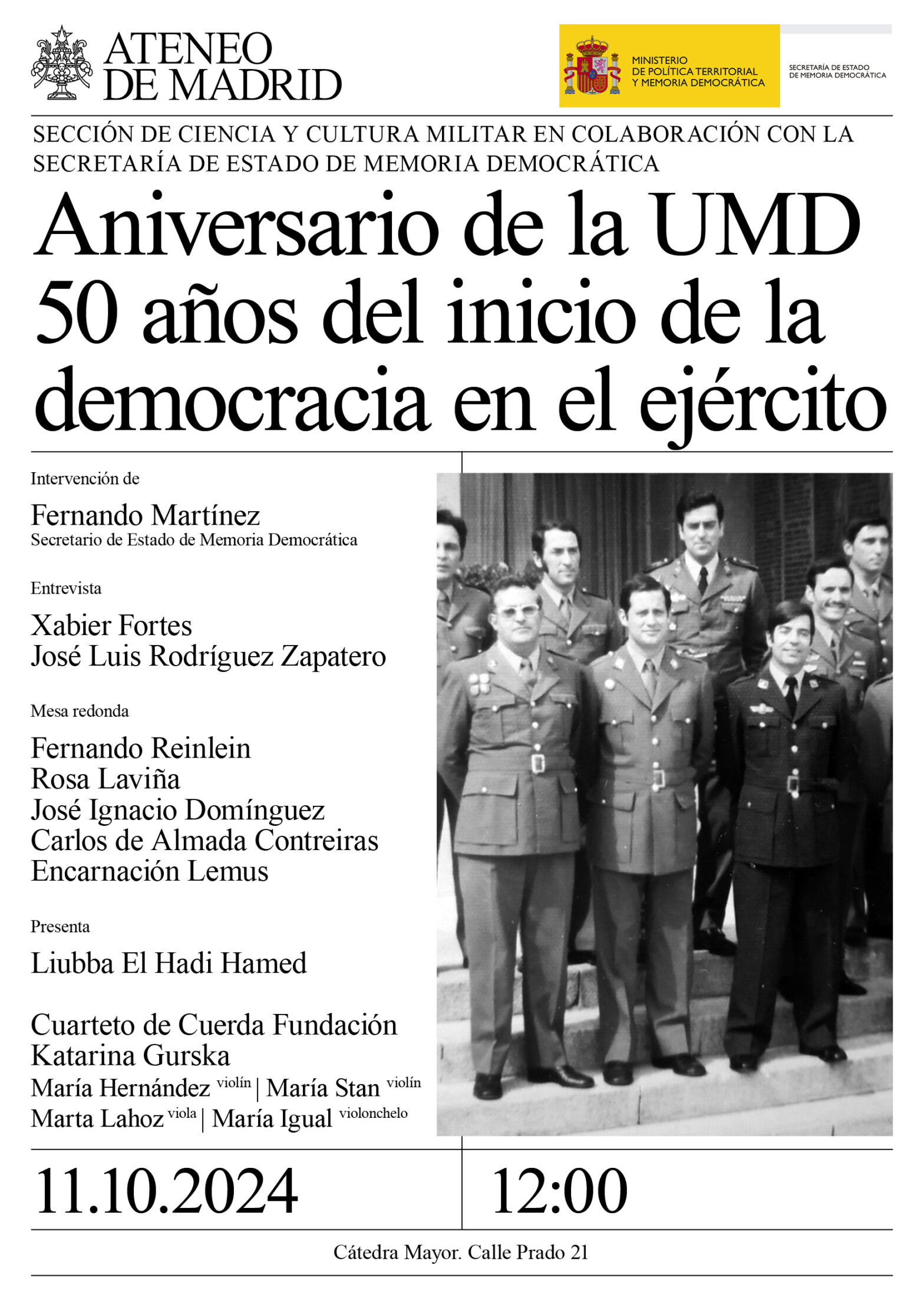 12.40.- Xabier Fortes modera la mesa redonda: Fernando Reinlein, teniente coronel y periodista, expulsado del Ejército por ser miembro de la Unión Militar Democrática (UMD); Rosa Laviña, viuda del capitán Antonio Herreros, miembro de la Unión Militar Democrática (UMD); José Ignacio Domínguez, teniente coronel, miembro de la Unión Militar Democrática (UMD); Encarnación Lemus, catedrática de Historia Contemporánea en la Universidad de Huelva; y Carlos de Almada Contreiras, capitán de navío (retirado), consejero de Estado y consejero de la Revolución de los Claveles de Portugal (1974-1975).