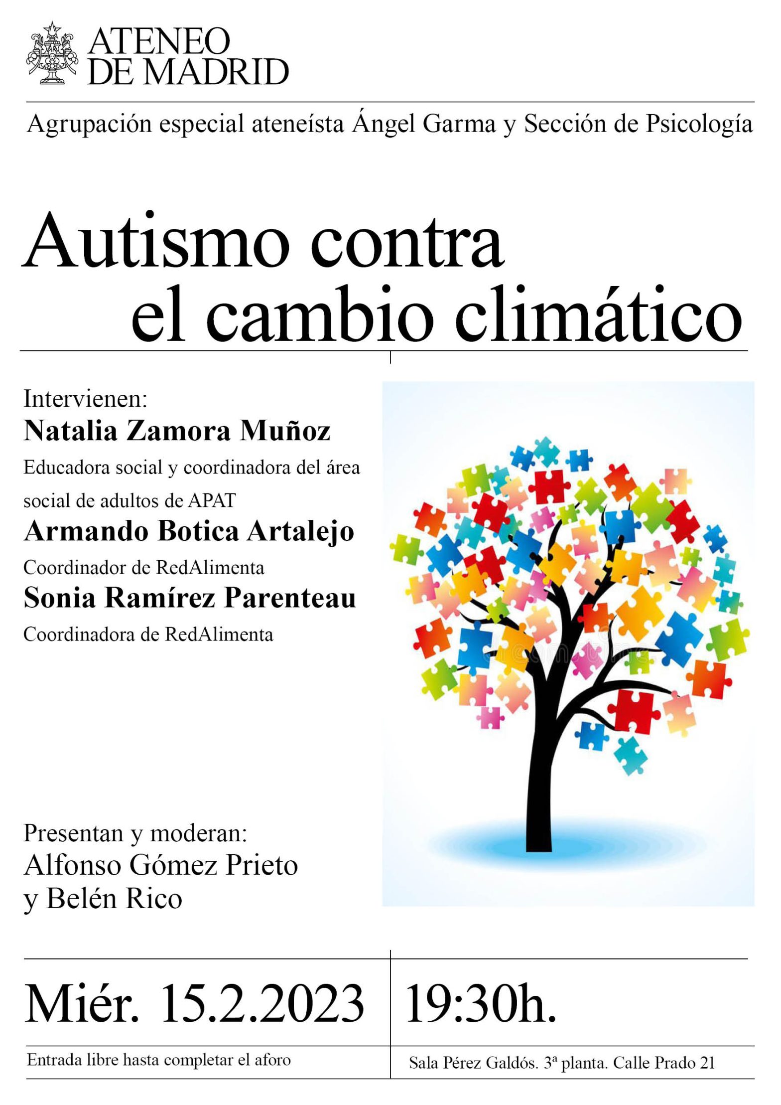 Agrupación especial ateneísta Ángel Garma y Sección de Psicología. Intervienen Natalia Zamora Muñoz: Educadora social y coordinadora del área social de adultos de APAT; Armando Botica Artalejo, coordinador de RedAlimenta y Sonia Ramírez Parenteau, coordinadorea de RedAlimenta. Presenta y modera Alfonso Gómez Prieto y Belén Rico. Sala Pérez Galdós. 19:30 h.