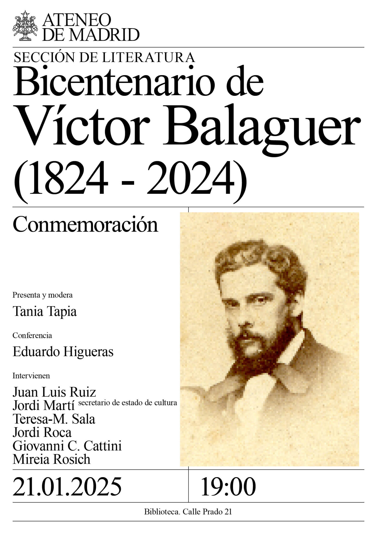 Sección de Literatura. Conferencia Víctor Balaguer y el giro conservador del liberalismo progresista entre el Sexenio Democrático y la Restauración, por Eduardo Higueras Castañeda, profesor de Historia Contemporánea de la Universidad Nacional de la Educación a Distancia (UNED). Mesa redonda: Juan Luis Ruiz, Jordi Martí, secretario de estado de cultura; Teresa -M. Sala, comisaria del bicentenario; Giovanni C. Cattini y Jordi Roca, miembros del comité ejecutivo del bicentenario; y Mireia Rosich, directora del Museo Víctor Balaguer. Presenta y modera la periodista Tania Tapia. Biblioteca. 19:00h.