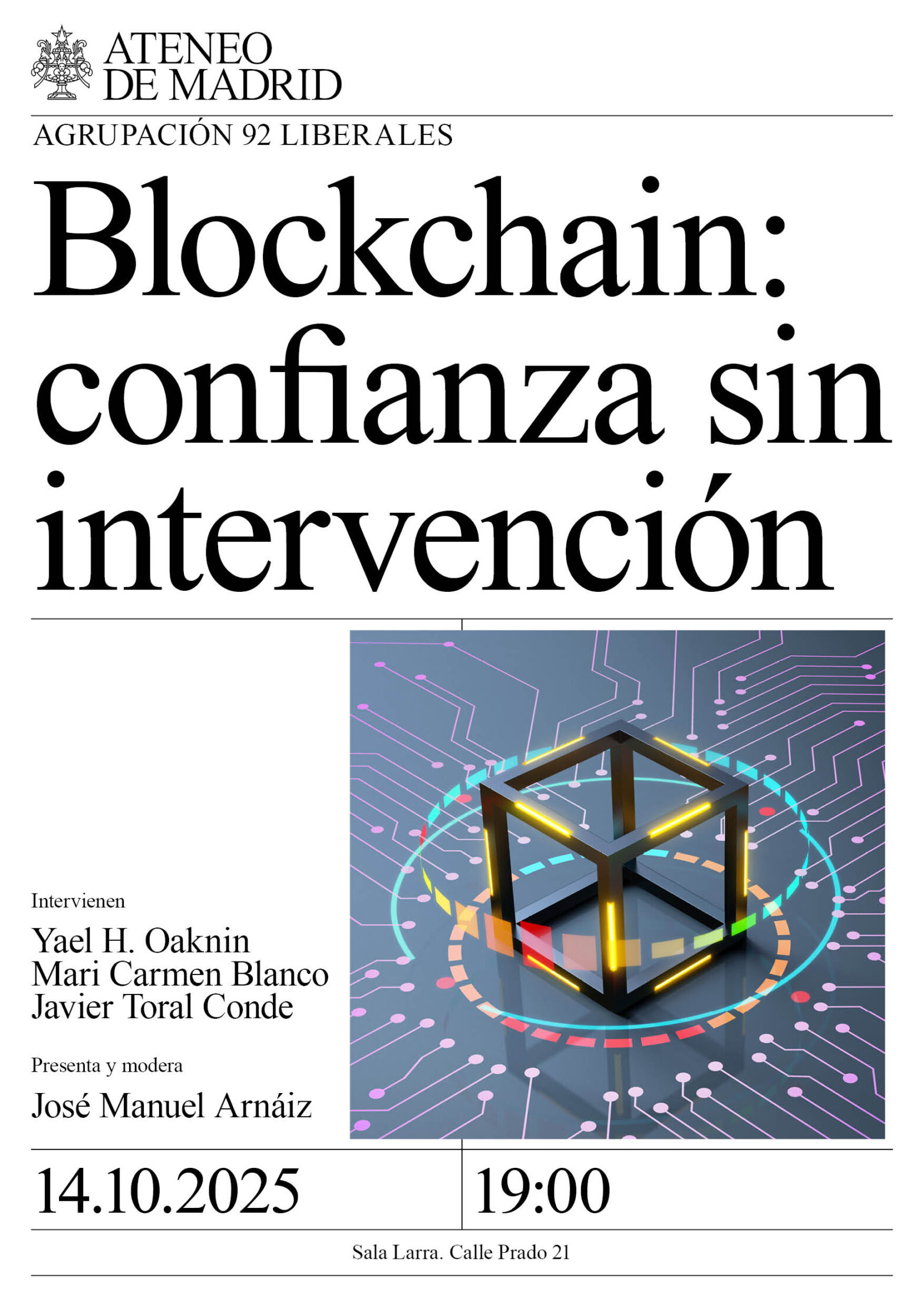 Agrupación 92 Liberales. Intervienen: Yael H. Oaknin, cofundadora de Token City y especialista en crypto activos, Mari Carmen Blanco, profesional del ámbito financiero e inmobiliario, especialista en blockchain, en finanzas descentralizadas y fundadora de MC Protoco; y Javier Toral Conde, CEO y fundador de Arguments, especialista en Blockchain. Presenta: José Manuel Arnáiz, fundador y empresario de más de 10 compañías innovadoras y start-ups, como Loozend, Knowee y ShoreView, fundador y consejero del operador móvil alternativo Digi Spain Telecom y consejero independiente de la matriz DIGI. Sala Larra. 19:00h.