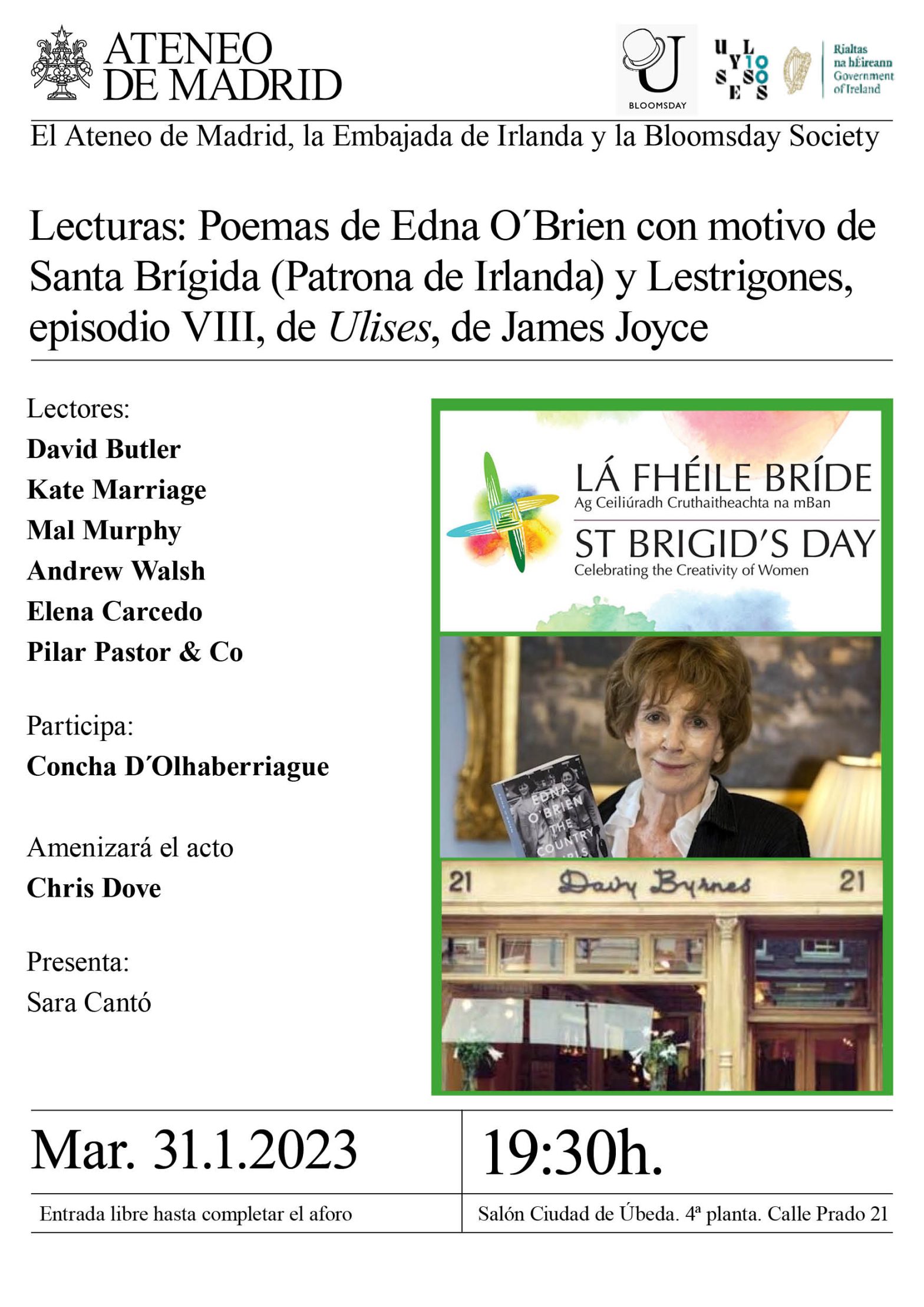 Lecturas: Poemas de Edna O´Brien con motivo de Santa Brígida (Patrona de Irlanda) y Lestrigones, episodio VIII, de Ulises, de James Joyce