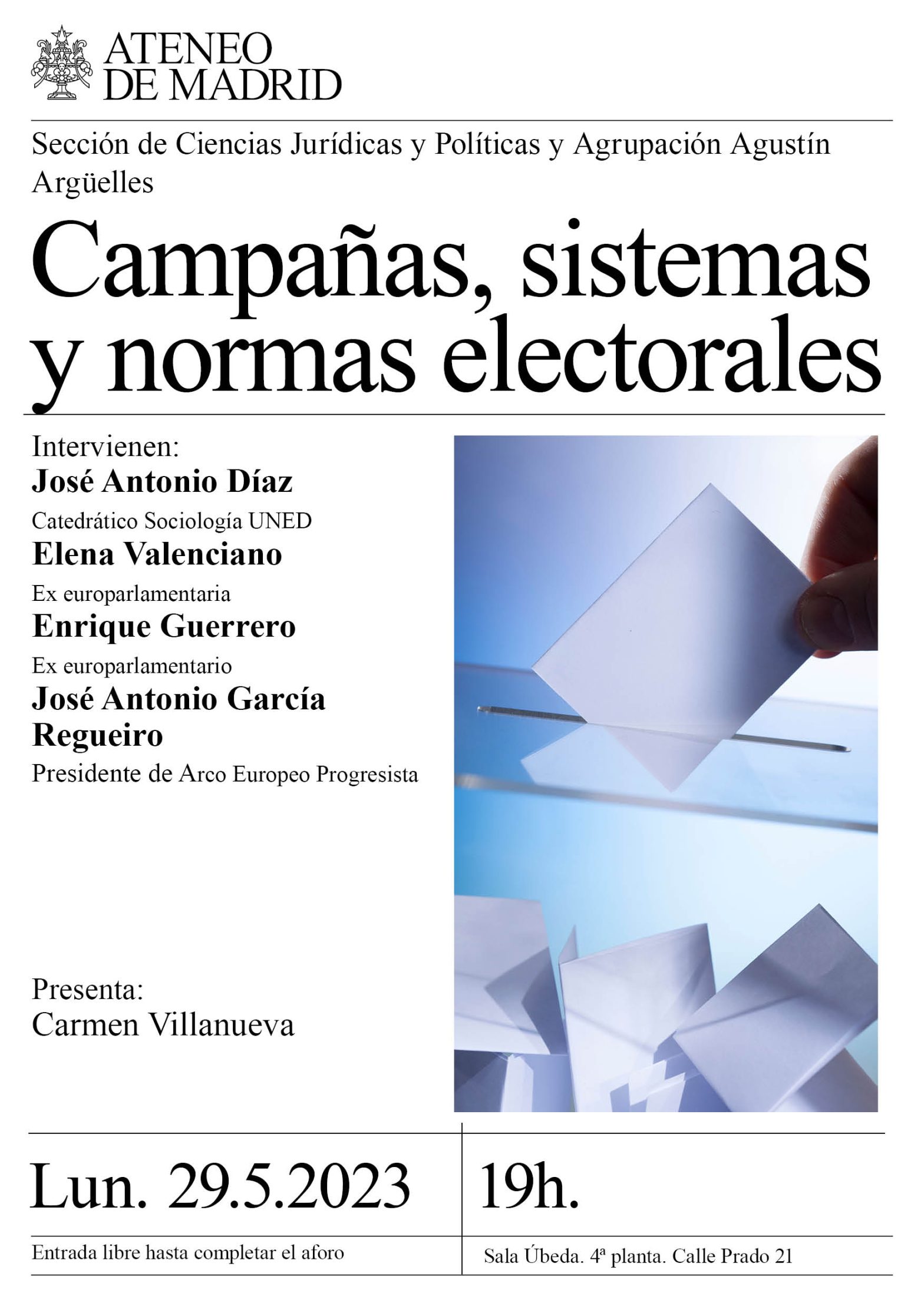 Sección de Ciencias Jurídicas y Políticas y Agrupación Agustín Argüelles. Presenta: Carmen Villanueva. Intervienen: José Antonio Díaz, catedrático Sociología UNED; Elena Valenciano, ex europarlamentaria; Enrique Guerrero, ex europarlamentario; José Antonio García Regueiro, presidente de Arco Europeo Progresista. Sala Úbeda: 19h.