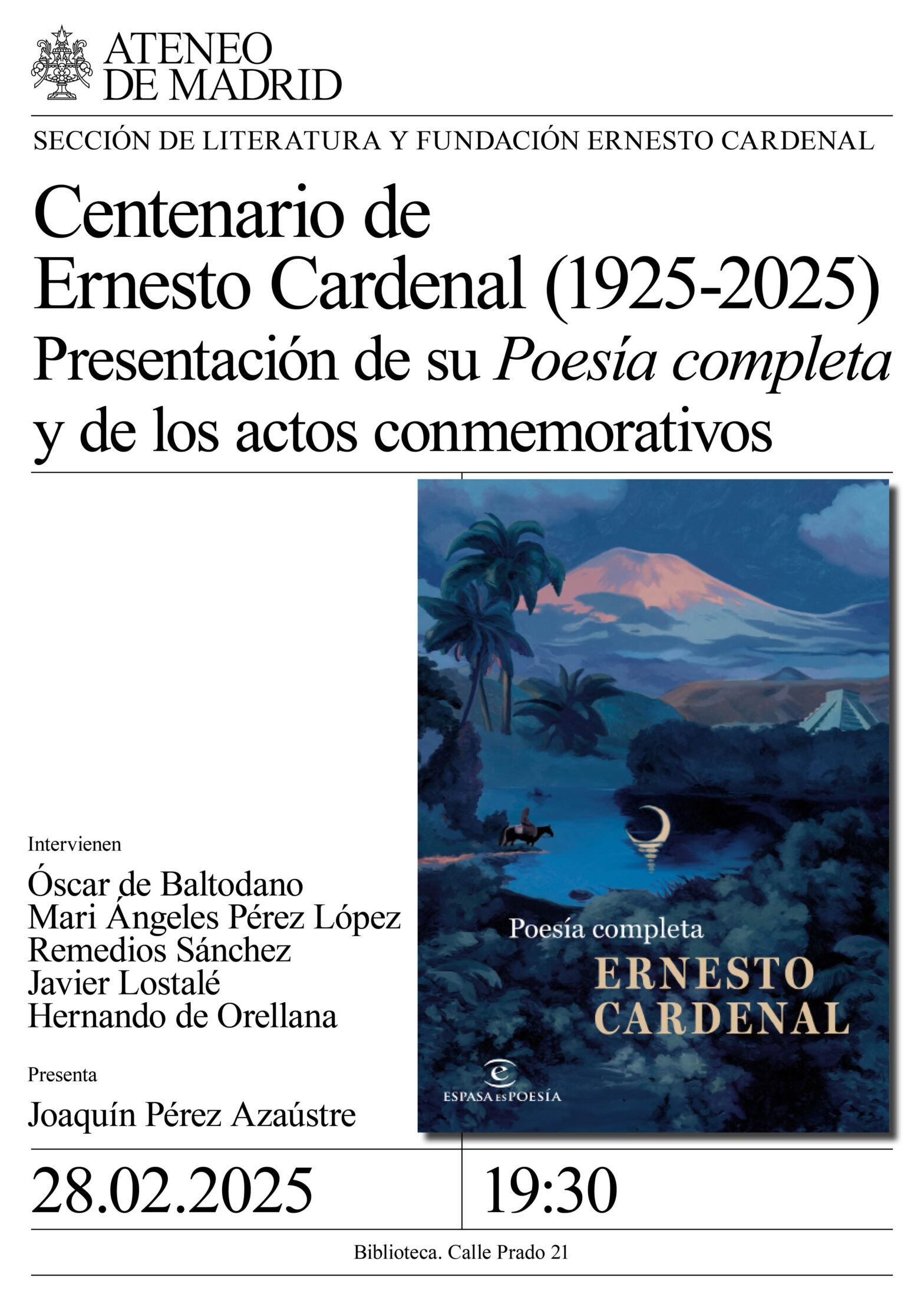 Sección de Literatura y Fundación Ernesto Cardenal. Intervienen: Óscar de Baltodano, vicepresidente de la Fundación Ernesto Cardenal; Mari Ángeles Pérez López, profesora de la Universidad de Salamanca y directora Académica de la Fundación Ernesto Cardenal; Remedios Sánchez, catedrática de la Universidad de Granada y responsable de la Poesía completa; Javier Lostalé, poeta; y Hernando de Orellana, Fundación Obra Pía de los Pizarro. Presenta: Joaquín Pérez Azaústre. Biblioteca. 19:30h.