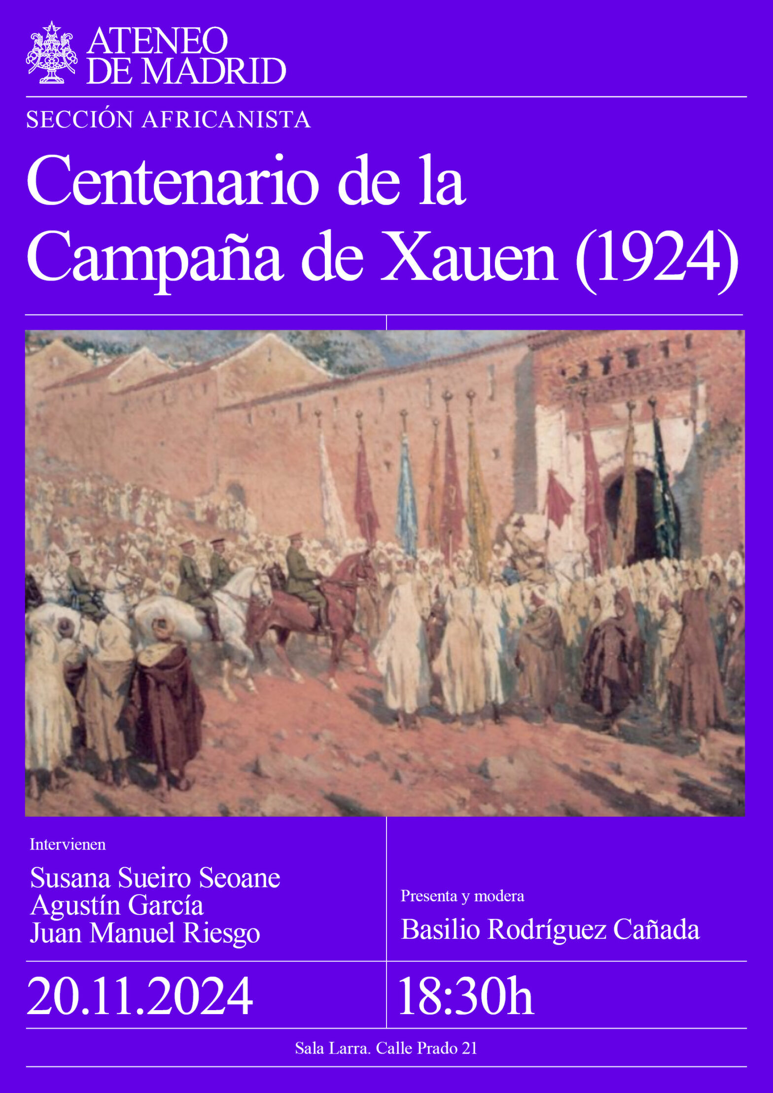 Sección Africanista. Intervienen: Susana Sueiro Seoane, catedrática de Historia Contemporánea de la UNED, autora de una biografía del General primo de Rivera; Agustín García, coronel (R) exdirector de la Biblioteca del Servicio Histórico Militar; y Juan Manuel Riesgo, profesor del Instituto de Humanidades de la URJC e historiador. Presenta y modera: Basilio Rodríguez Cañada. Sala Larra. 18:30h.