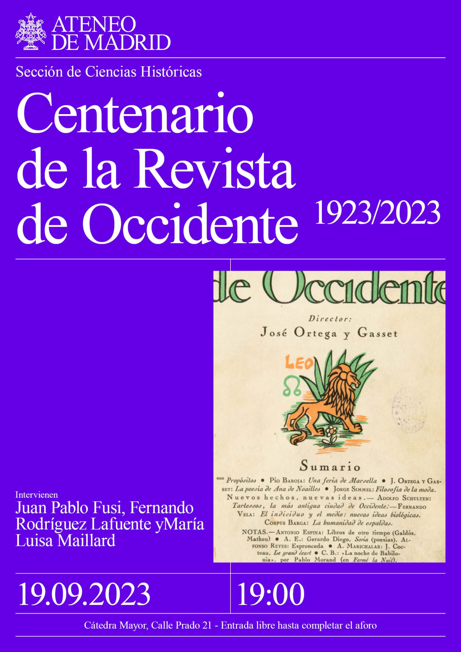 Sección de Ciencias Históricas. Intervienen: Fernando Rodríguez Lafuente, director de la Revista de Occidente; María Luisa Maillard, escritora y Juan Pablo Fusi, Real Academia de la Historia. Cátedra Mayor. 19h.