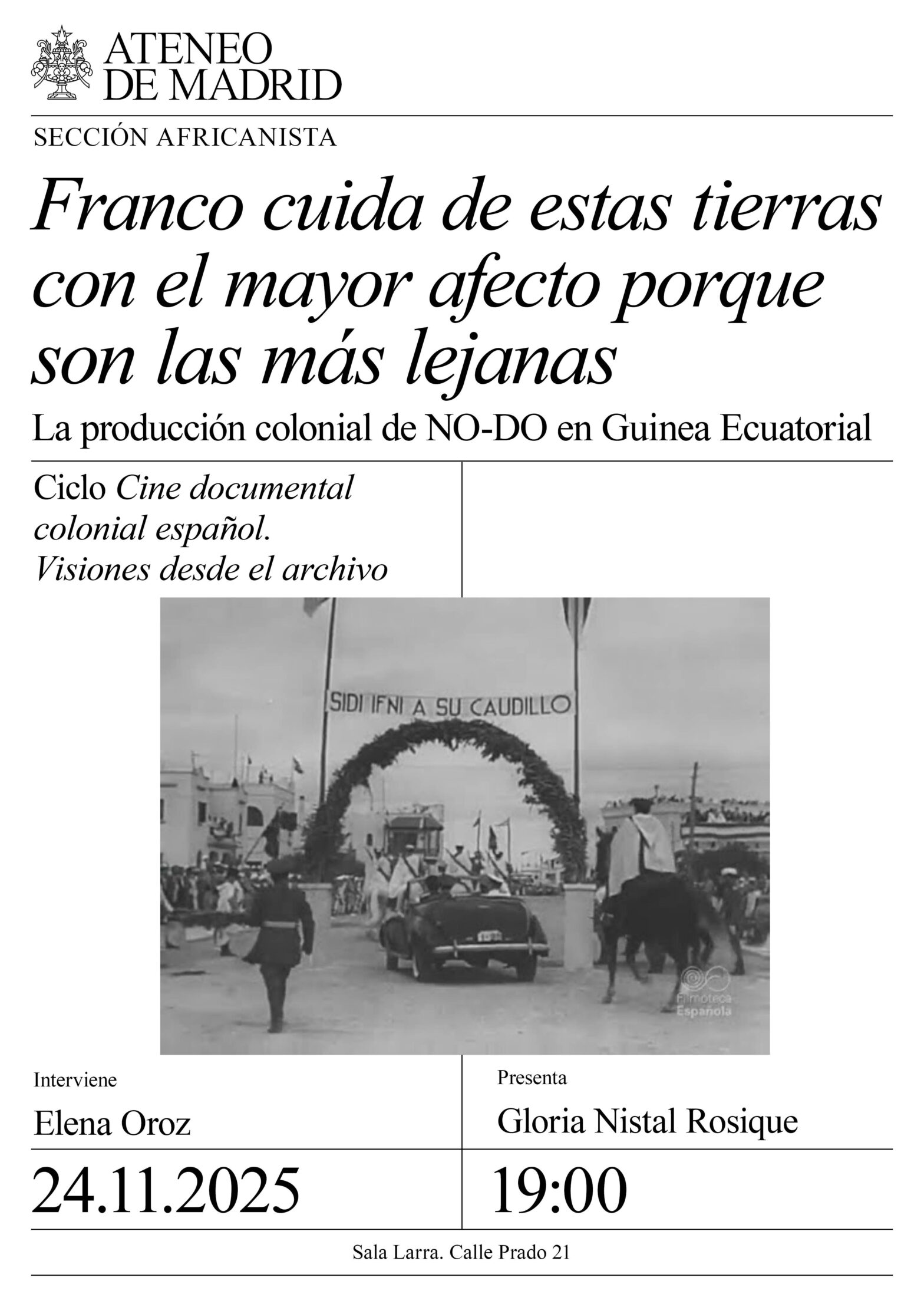 Sección Africanista. Ciclo «Cine documental coloquial español. Visiones desde el archivo». Interviene: Elena Oroz, Universidad Carlos III de Madrid. Presenta: Gloria Nistal Rosique. Sala Larra. 19:00h.