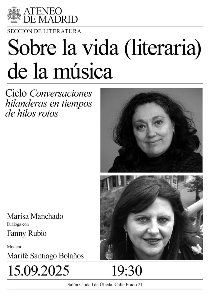 Sección de Literatura. Marisa Manchado, compositora, Premio Nacional de Composición 2024, intérprete, pedagoga dialoga con Fanny Rubio, escritora, poeta, catedrática emérita de la UCM. Modera: Marifé Santiago Bolaños. Salón Ciudad de Úbeda. 19:30h.