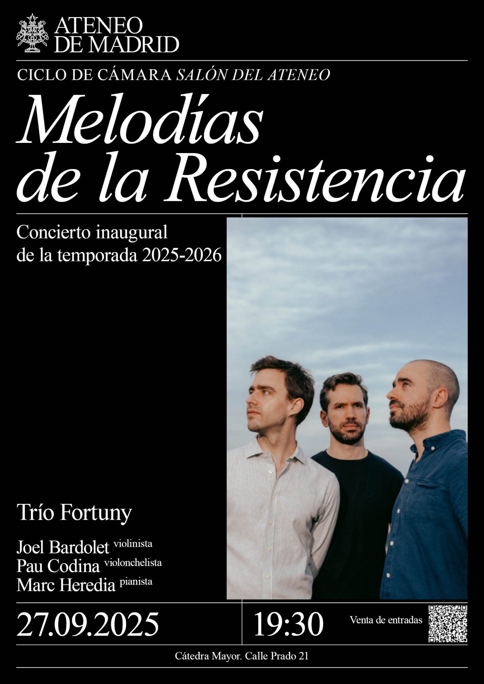 Tala Produciones. El concierto inaugural de la temporada 2025-2026 del ciclo de cámara Salón del Ateneo estará protagonizado por el aclamado Trío Fortuny, con su programa Melodías de la Resistencia. En conmemoración del 50 aniversario de la muerte de Shostakóvich, el ensemble interpretará dos tríos del aclamado compositor soviético, junto al trío op. 38 de Salvador Brotons.