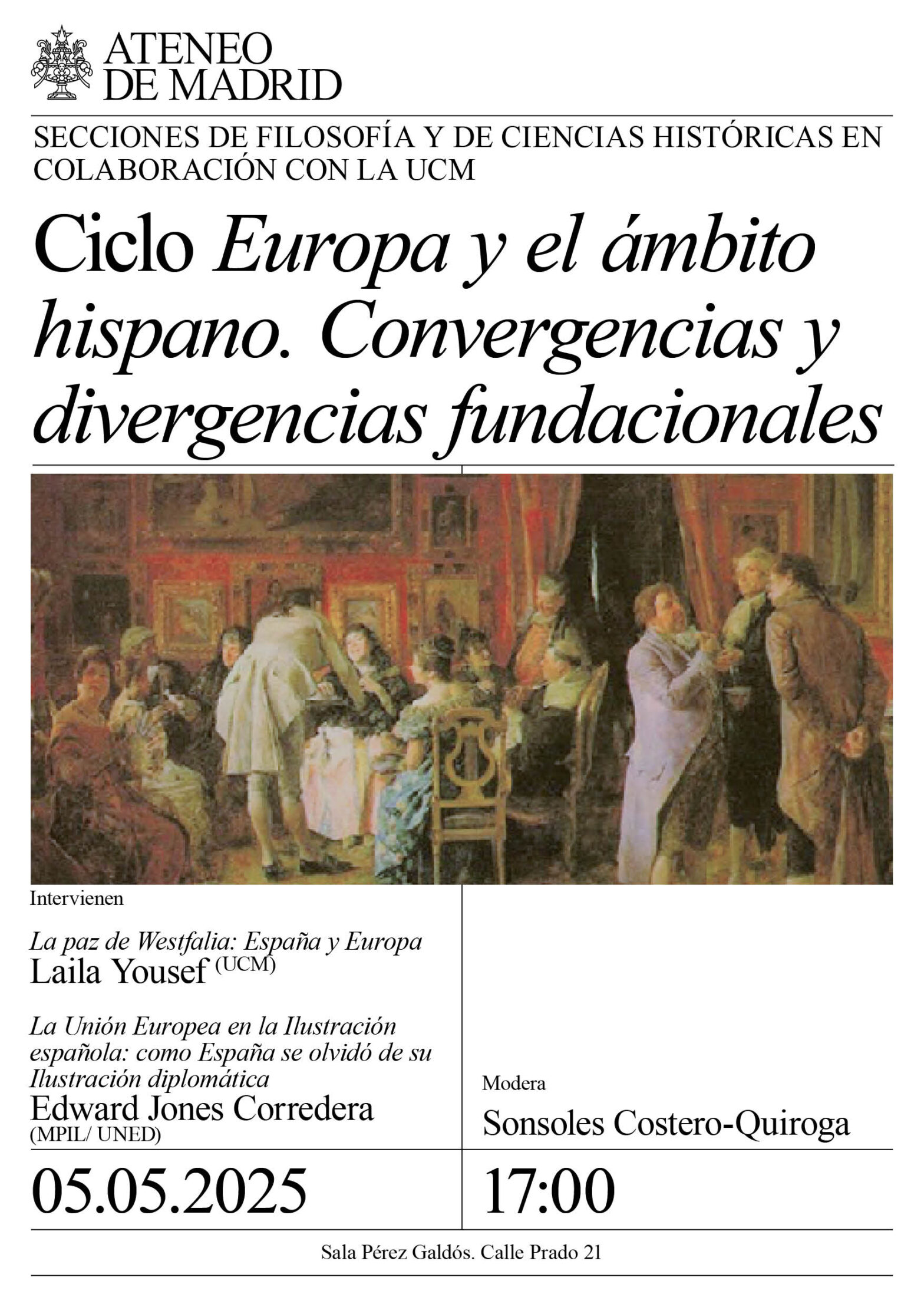 Secciones de Filosofía y de Ciencias Históricas en colaboración con la UCM. Intervienen: Laila Yousef (UCM): La paz de Westfalia: España y Europa y Edward Jones Corredera (MPIL/ UNED) La unión europea en la Ilustración española: como España se olvidó de su Ilustración diplomática. Modera: Sonsoles Costero-Quiroga (UCM). Sala Pérez Galdós. 17:00h.