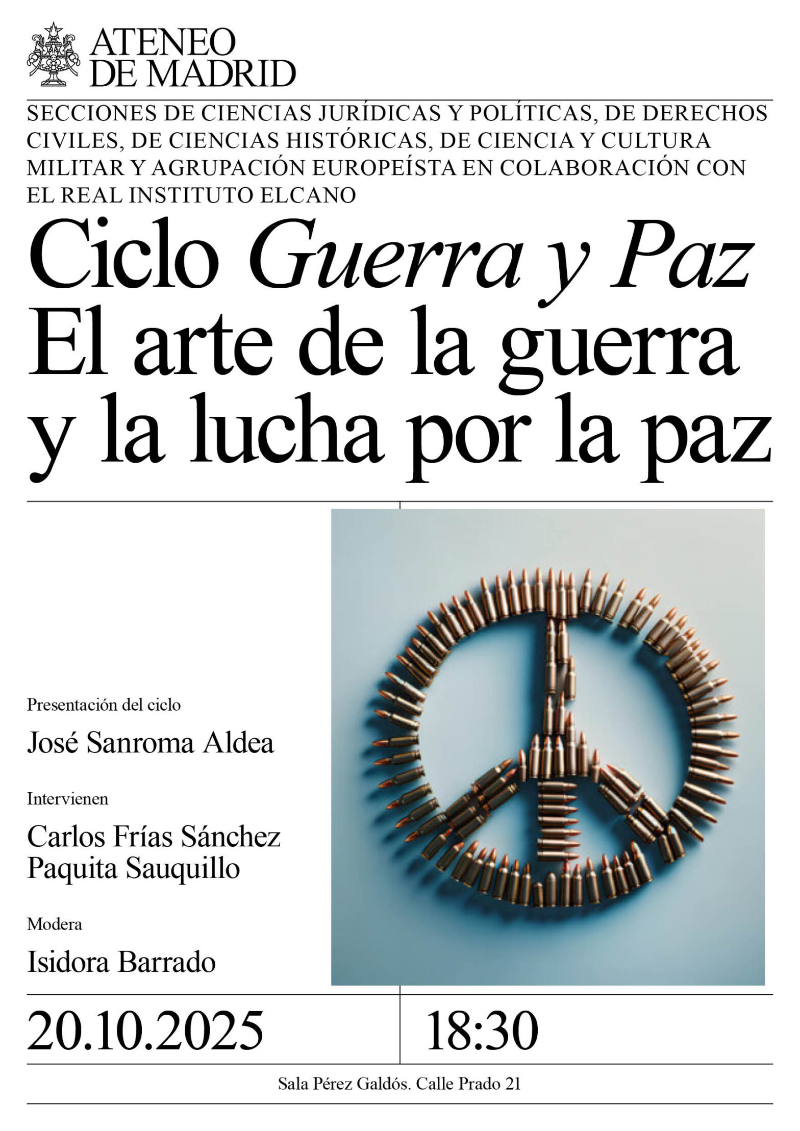 Secciones de Ciencias Jurídicas y Políticas, de Derechos Civiles, de Ciencias Históricas, de Ciencia y Cultura Militar y Agrupación Europeísta en colaboración con el Real Instituto Elcano. Presentación del ciclo: José Sanroma Aldea. Intervienen: Carlos Frías Sánchez, director de la Escuela de Guerra del Ejército y Francisca Sauquillo, fundadora del Movimiento por la Paz MPDL. Modera: Isidora Barrado. Sala Pérez Galdós. 18:30h.