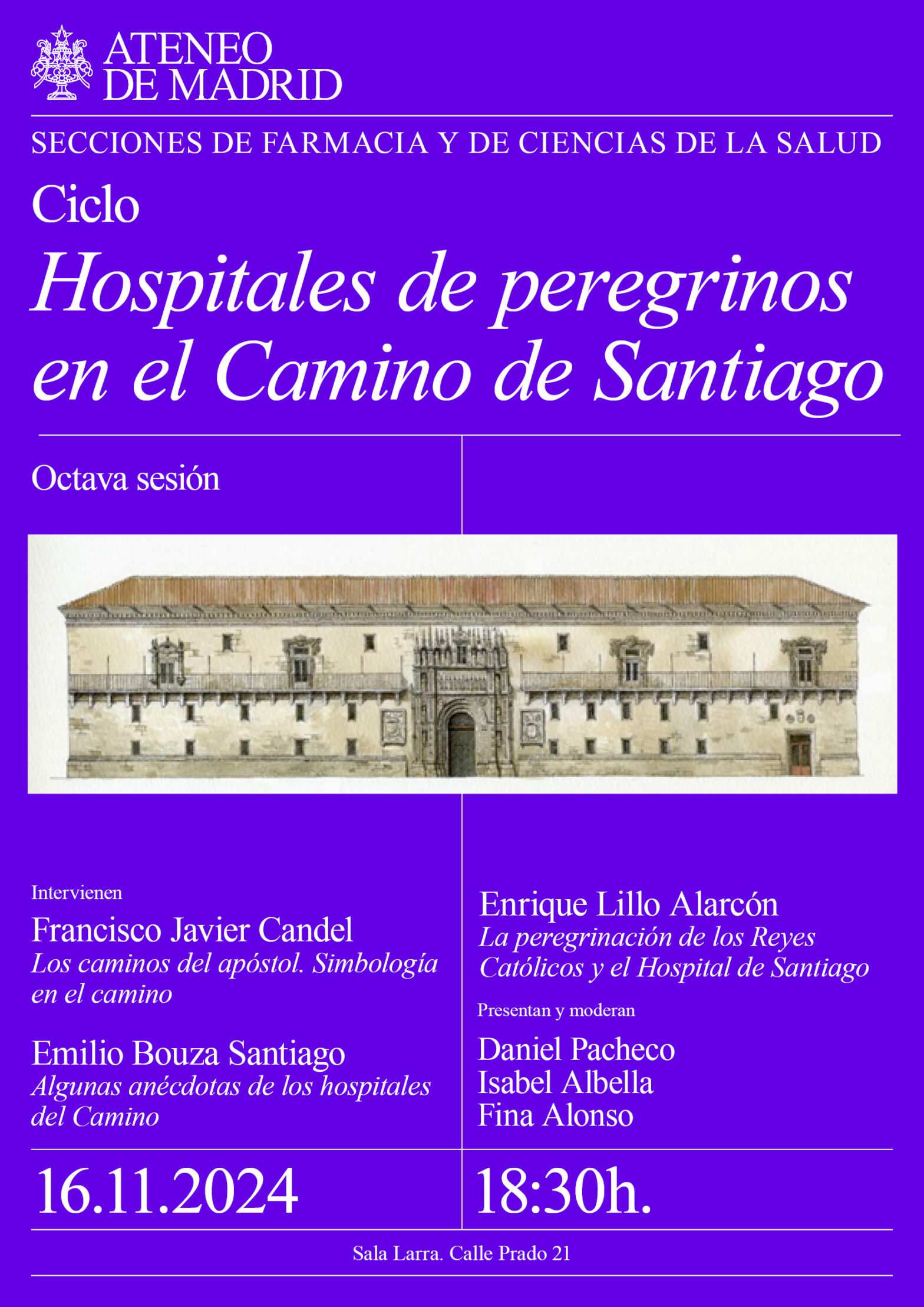 Secciones de Farmacia y de Ciencias de la Salud. Octava sesión. Intervienen: Francisco Javier Candel «Los caminos del Apostol. Simbologia en el Camino»; Emilio Bouza Santiago «Algunas anécdotas de los Hospitales del Camino»; Enrique Lillo Alarcón «La peregrinación de los Reyes Católicos y el Hospital de Santiago». Presentan y moderan: Daniel Pacheco, Isabel Albella y Fina Alonso. Sala Larra. 18:30h.