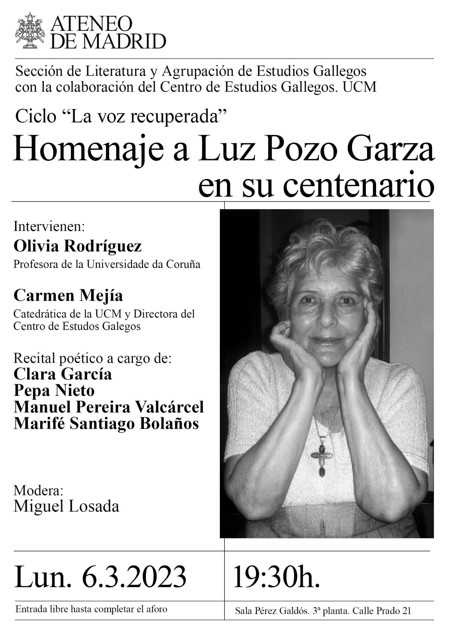Sección de Literatura y Agrupación de Estudios Gallegos con la colaboración del Centro de Estudios Gallegos. UCM. Intervienen: Olivia Rodríguez, profesora de la Universidade da Coruña; Carmen Mejía, catedrática de la UCM y Directora del Centro de Estudos Galegos. Recital poético a cargo de: Clara García, Pepa Nieto, Manuel Pereira Valcárcel, Marifé Santiago Bolaños. Modera: Miguel Losada. Sala Pérez Galdós. 19:30h.