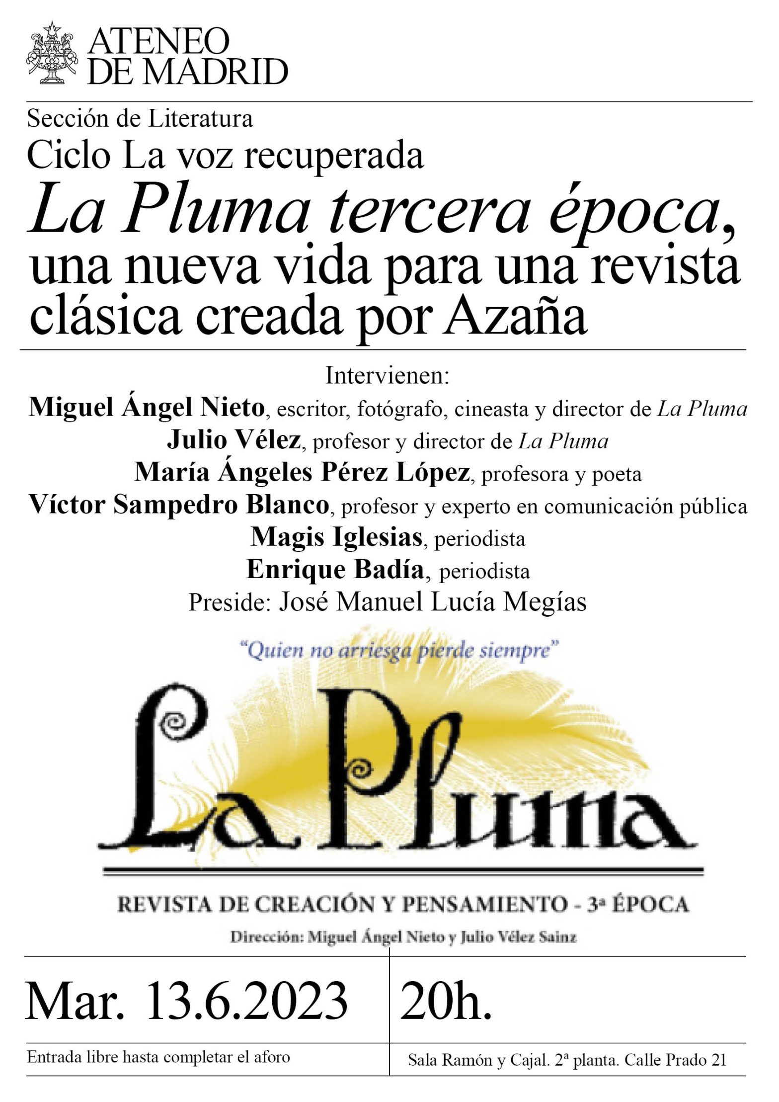 Sección de Literatura. Intervienen: Miguel Ángel Nieto, escritor, fotógrafo, cineasta y director de La Pluma; Julio Vélez, profesor y director de La Pluma; María Ángeles Pérez López, profesora y poeta; Víctor Sampedro Blanco, profesor y experto en comunicación pública; Magis Iglesias, periodista; Enrique Badía, periodista. Preside: José Manuel Lucía Megías. Sala Ramón y Cajal. 20h.