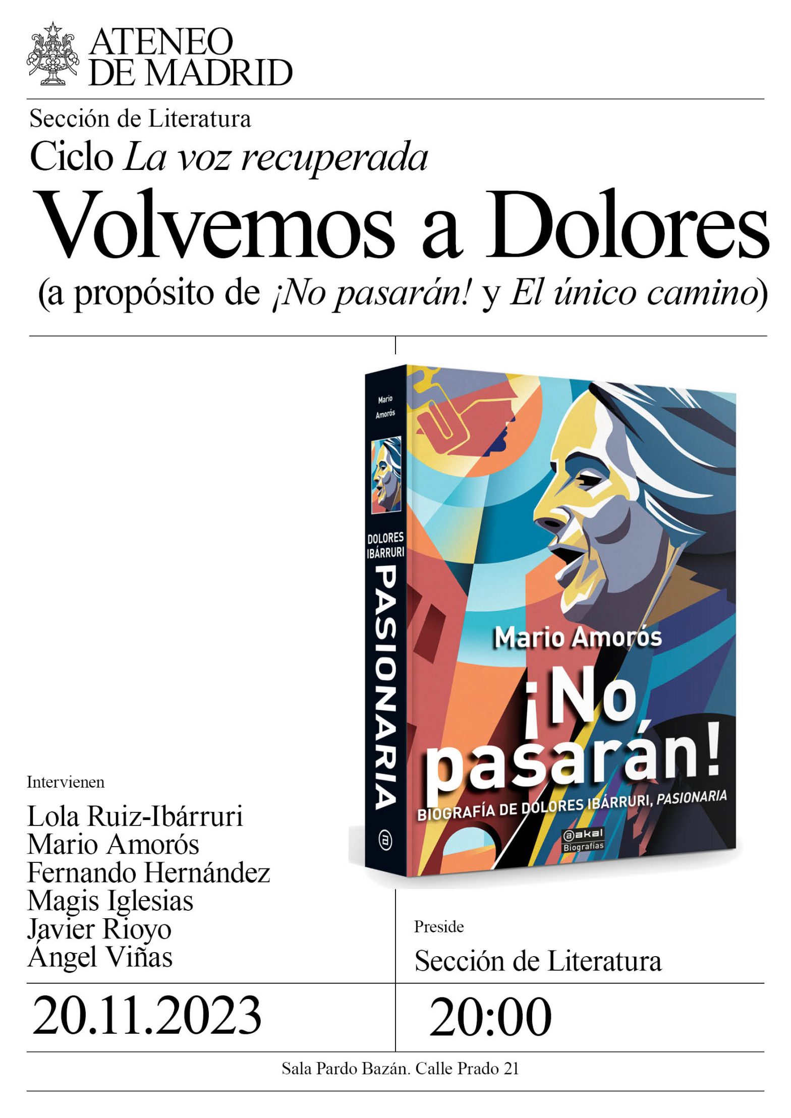 Sección de Literatura. Intervienen: Lola Ruiz-Ibárruri, nieta de Dolores Ibárruri; Mario Amorós, historiador y autor de la biografía de Dolores Ibárruri ¡No pasarán!; Fernando Hernández, historiador; Magis Iglesias, periodista y autora del libro Fuimos nosotras; Javier Rioyo, escritor y director del Instituto Cervantes de Tánger; y Ángel Viñas, historiador. Preside: Sección de Literatura. Sala Pardo Bazán. 20h.