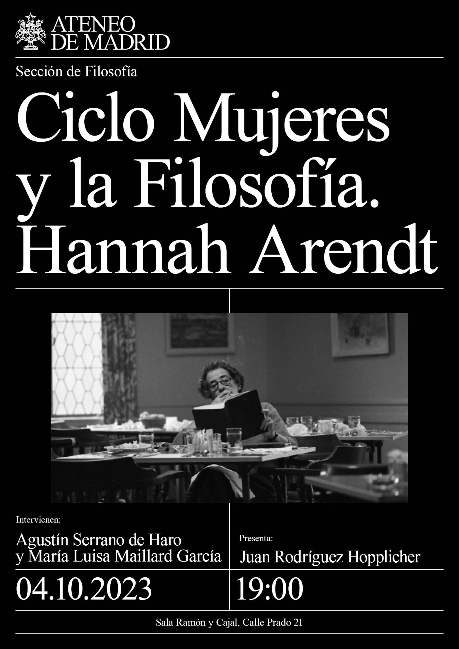 Sección de Filosofía. Intervienen: Agustín Serrano de Haro y María Luisa Millard García, doctora en Filología, con Premio Extraordinario, es presidenta de la Asociación Matritense de Mujeres Universitarias. Presenta Juan Rodríguez Hopplicher. Sala Ramón y Cajal. 19h.