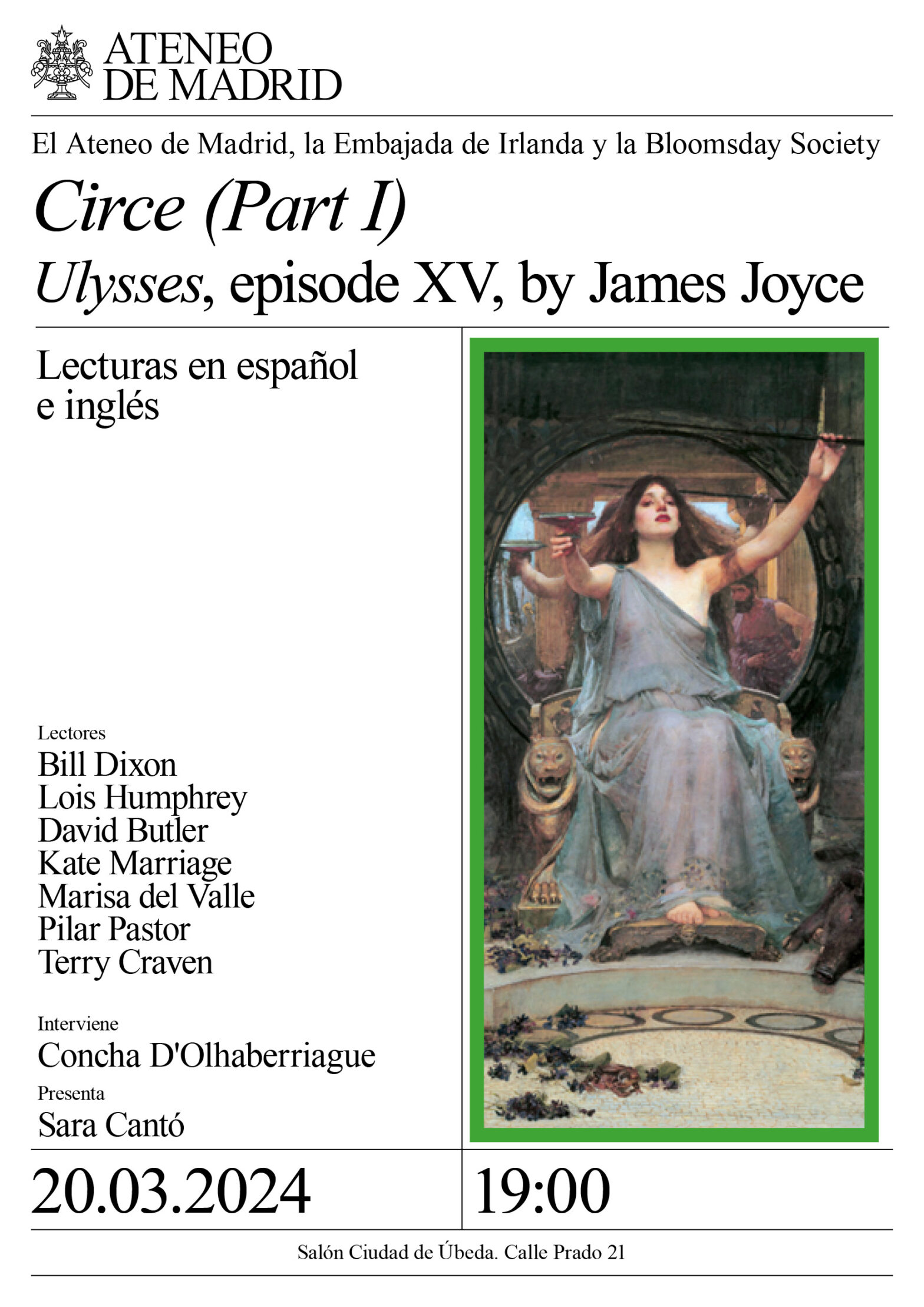 Embajada de Irlanda y la Bloomsday Society. Lectores: Bill Dixon, Lois Humphrey, David Butler, Kate Marriage, Marisa del Valle, Pilar Pastor y Terry Craven. Presenta: Sara Cantó. Interviene: Concha D’Olhaberriague. Salón Ciudad de Úbeda. 19:00h.