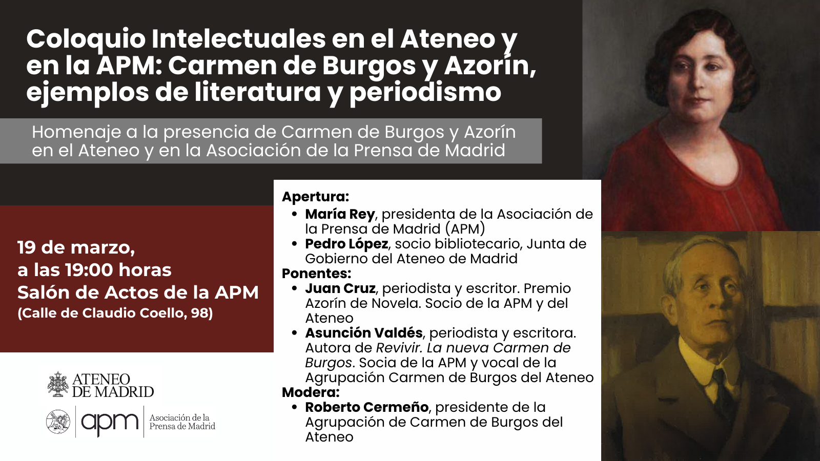 Asociación de la Prensa de Madrid y Ateneo de Madrid. Apertura: María Rey, presidenta de la Asociación de la Prensa de Madrid; y Pedro López, socio bibliotecario, Junta de Gobierno del Ateneo de Madrid. Ponentes: Juan Cruz Ruiz, periodista y escritor. Premio Azorín de Novela. Socio de la APM y del Ateneo; Asunción Valdés, periodista y escritora. Autora de Revivir. La nueva Carmen de Burgos. Socia de la APM y vocal de la Agrupación Carmen de Burgos del Ateneo. Moderador: Roberto Cermeño, presidente de la Agrupación de Carmen de Burgos del Ateneo.