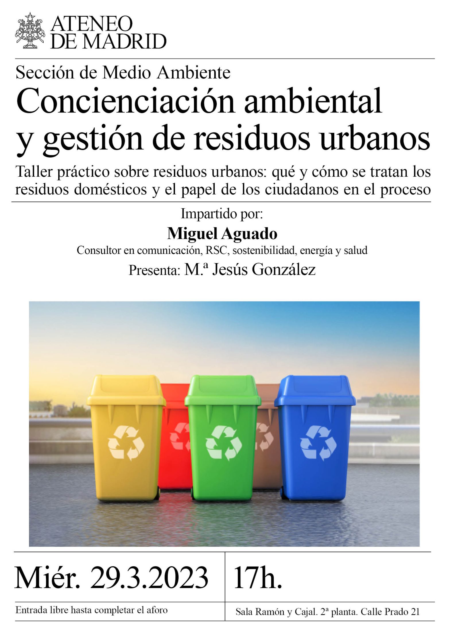 Taller práctico sobre residuos urbanos: qué y cómo se tratan los residuos domésticos y el papel de los ciudadanos en el proceso. Organiza: Sección de Medio Ambiente. Impartido por: Miguel Aguado, consultor en comunicación, RSC, sostenibilidad, energía y salud. Presenta: M.ª Jesús González. Sala Ramón y Cajal. 17h.