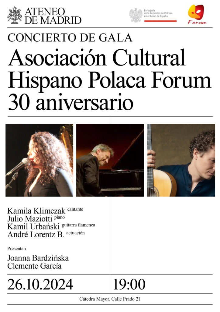 KAMILA KLIMCZAK, cantante; JULIO MAZIOTTI, piano; KAMIL URBAŃSKI, guitarra flamenca; y ANDRÉ LORENTZ B., actuación. Presentan: Joanna Bardzińska y Clemente García. Cátedra Mayor. 19:00h.