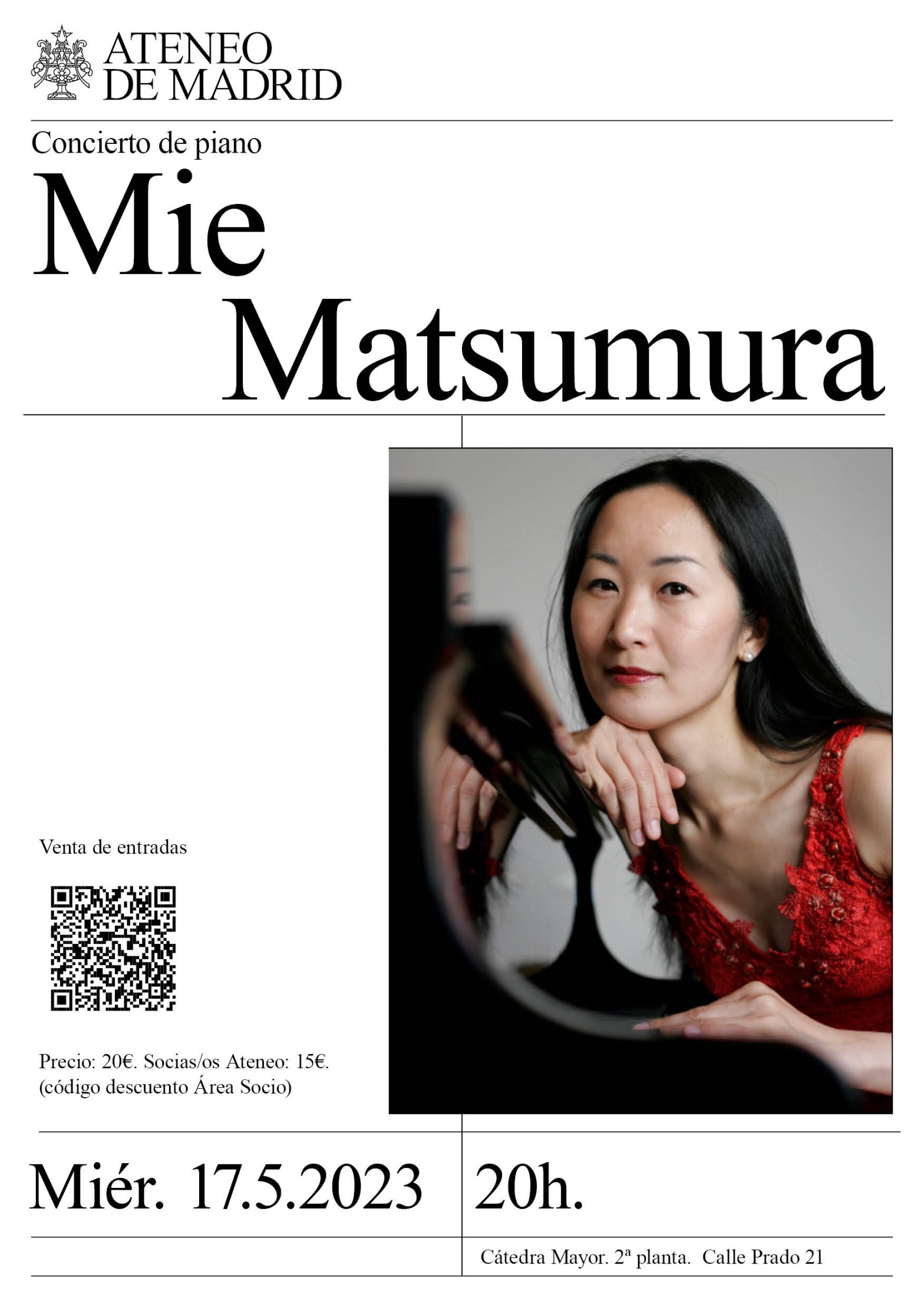 El Ateneo de Madrid presenta a la virtuosa pianista japonesa Mie Matsumura, quien nos ofrecerá un repertorio altamente atractivo, partiendo del severo clasicismo de J. S. Bach, para continuar recorriendo los intrincados mundos sonoros del romanticismo de Franz Liszt, el lirismo japonés de Toshio Kashiwagi, hasta sorprendernos con su sensible interpretación de algunas de las piezas más emblemáticas de Isaac Albéniz y Enrique Granados. 19:30h. miematsumura.com