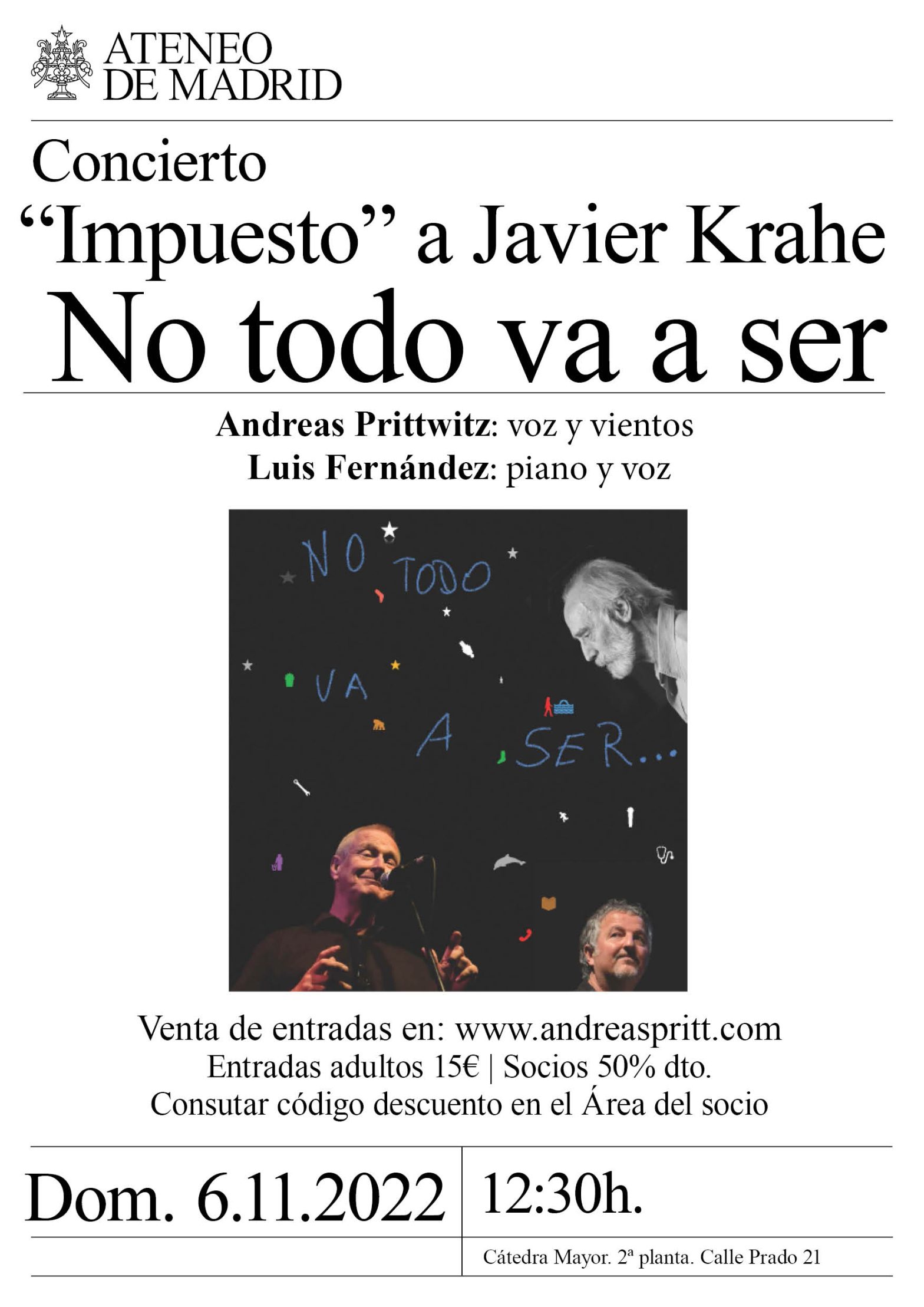Andreas Prittwitx, voz y vientos y Luis Fernández, piano y voz. Salón de Actos. Venta de entradas en: www.andreaspritt.com Entradas 15€ adultos. Socios 50% descuento, el código de descuento para los socios en el Área del Socio. Nota de prensa.