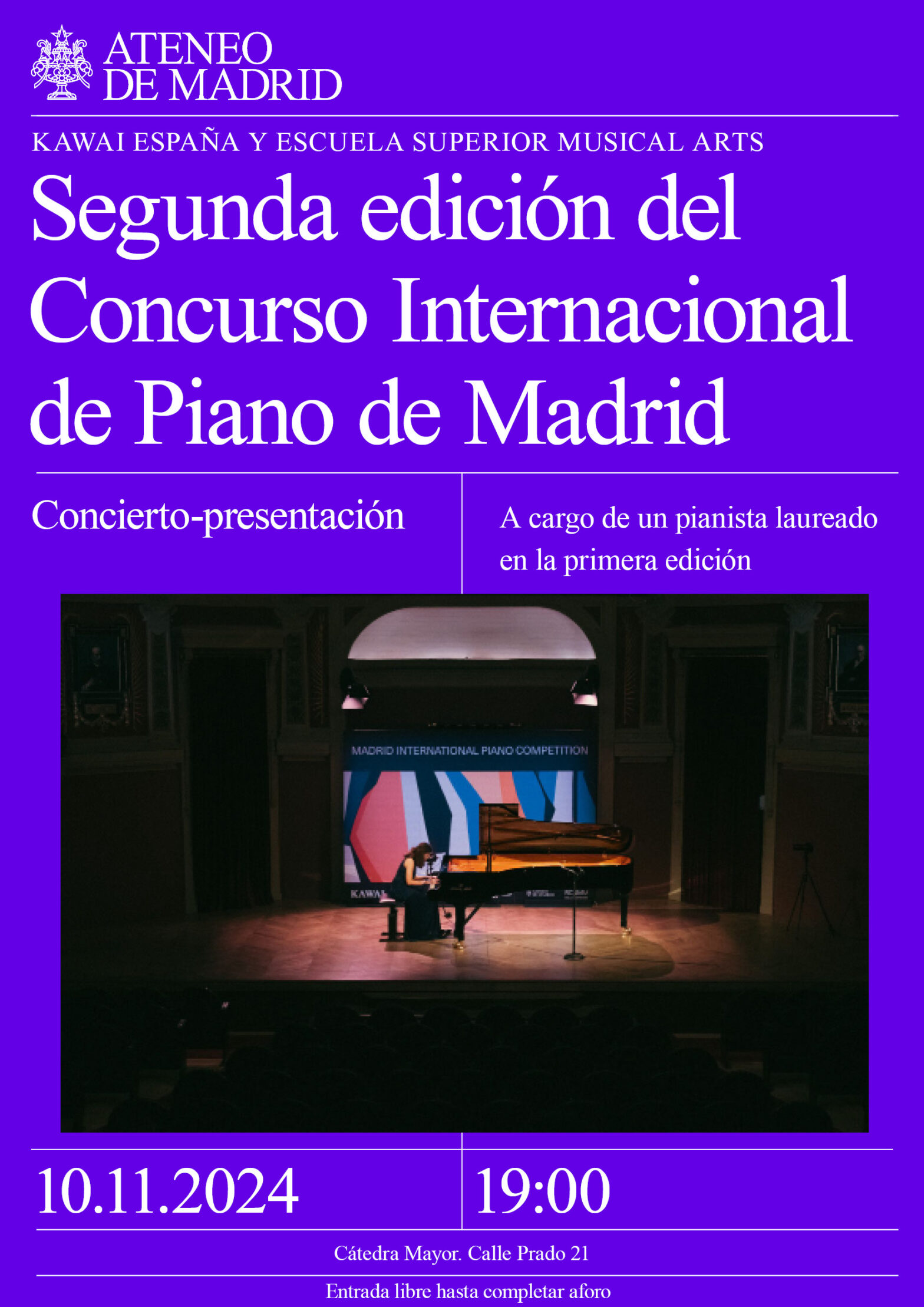 Organizan: Kawai España, Escuela Superior Musical Arts y Ateneo de Madrid. A cargo de un pianista laureado en la primera edición. Cátedra Mayor. 19:00h.