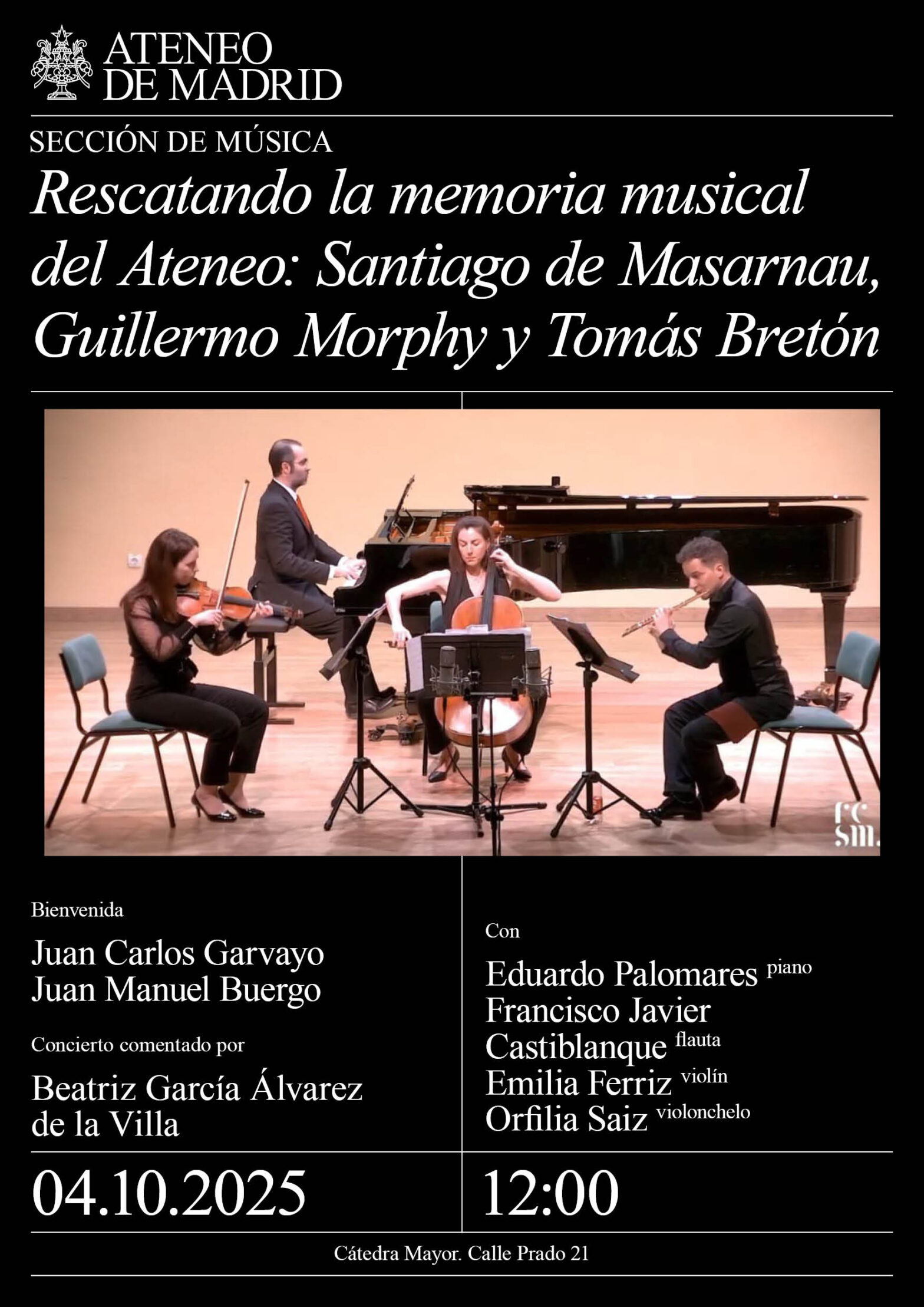 Sección de Música. Bienvenida: JConcierto comentado por: Beatriz García Álvarez de la Villa. Con Eduardo Palomares, piano; Francisco Javier Castiblanque, flauta; Emilia Ferriz, violín; y Orfilia Saiz, violonchelo. Cátedra Mayor. 12:00h. Programa (ver).