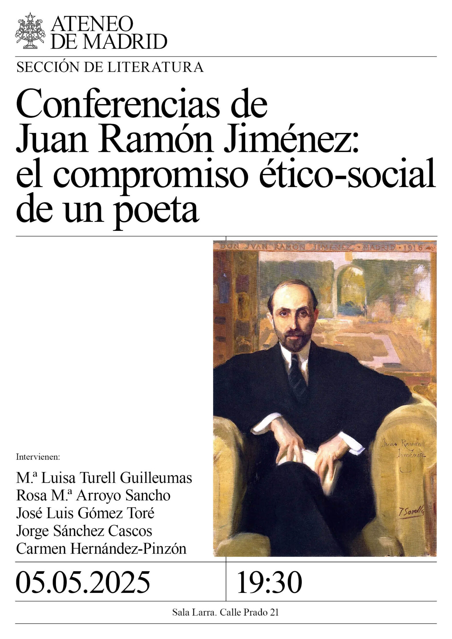 Sección de Literatura. Intervienen: M.ª Luisa Turell Guilleumas, licenciada en Filología Hispánica, profesora de ESO y Bachillerato; Rosa M.ª Arroyo Sancho, licenciada en Filología Hispánica; José Luis Gómez Toré, poeta, ensayista y traductor; Jorge Sánchez Cascos, licenciado en Filología Hispánica; y Carmen Hernández-Pinzón, sobrina-nieta de Juan Ramón Jiménez e incansable promotora de publicaciones de material inédito de Juan Ramón Jiménez y Zenobia Camprubí. Sala Larra. 19:30h.