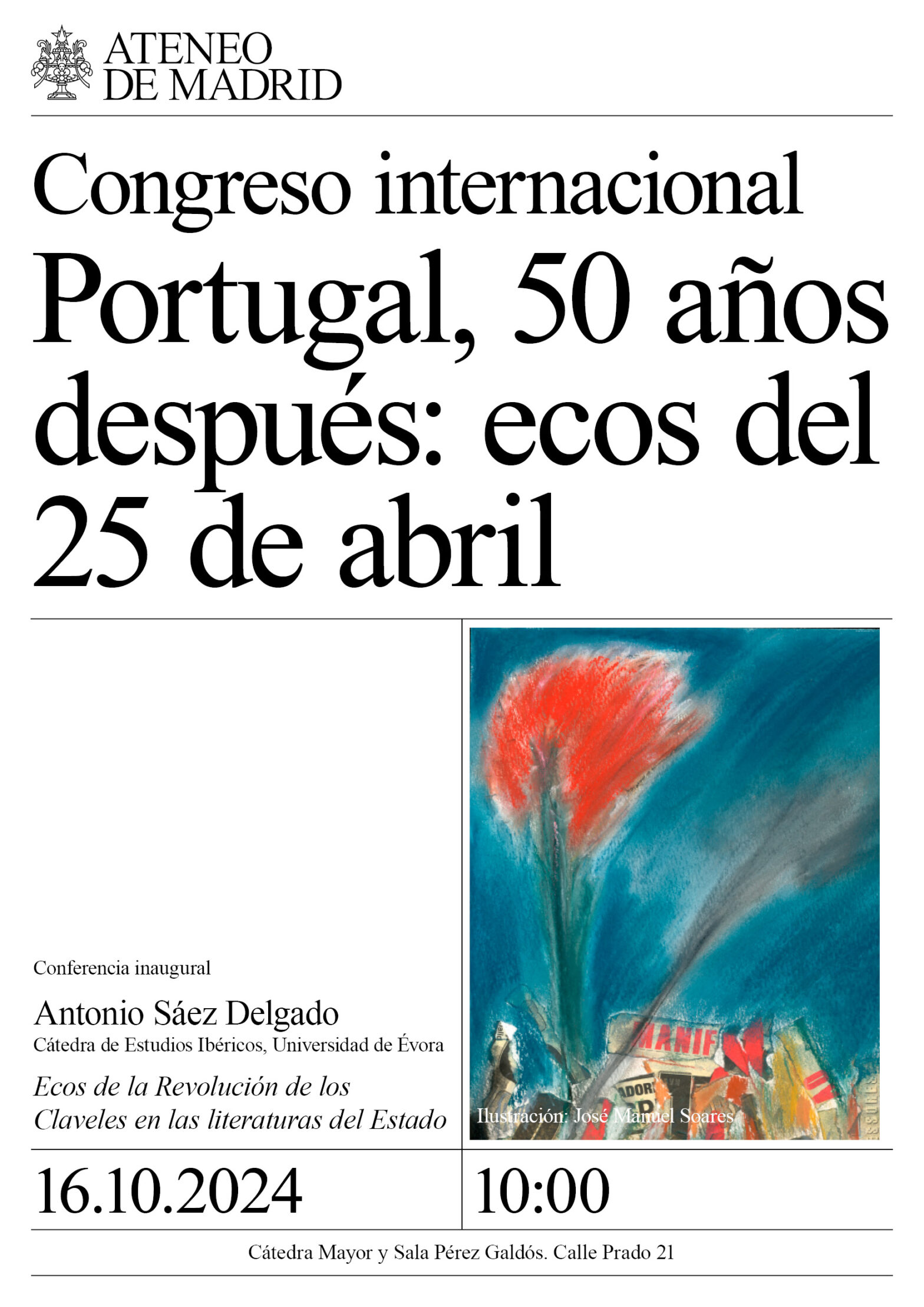 Conferencia inaugural de Antonio Sáez Delgado. Cátedra de Estudios Ibéricos, Universidad de Évora. Ecos de la Revolución de los Claveles en las literaturas del Estado. Con la asistencia de: João Mira-Gomes, embajador de Portugal en España; Santiago Palacios, vicerrector de grado de la Universidad Autónoma de Madrid; Patricia Martínez, decana de la Facultad de Filosofía y Letras de la Universidad Autónoma de Madrid. Cátedra Mayor. Sesiones de conferencias Sala Pérez Galdós. 10:00h. Díptico. Programa