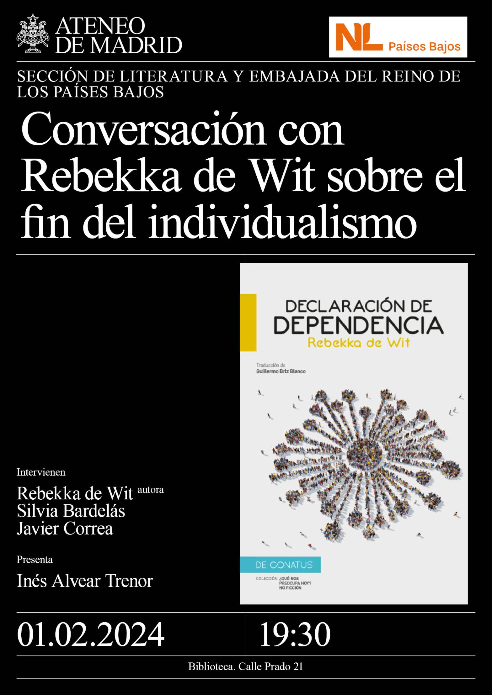 Sección de Literatura y embajada del Reino de los Países Bajos. Intervienen: Rebekka de Wit, autora; Silvia Bardelás, editora; y Javier Correa, redactor y editor en Filosofía & Co. Presenta: Inés Alvear Trenor. Biblioteca. 19:30h.