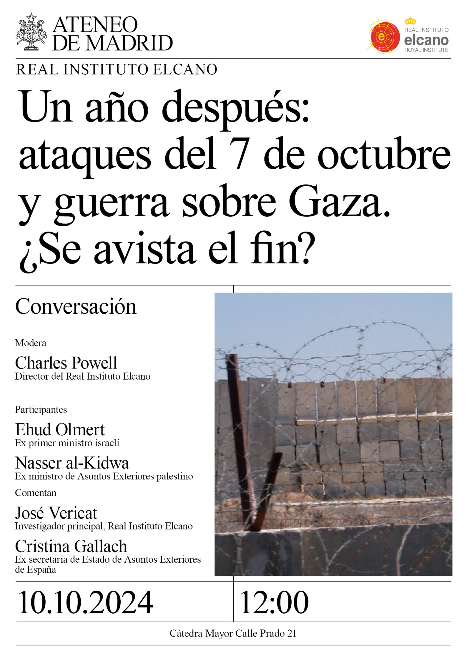 Real Instituto Elcano. Modera: Charles Powell, director del Real Instituto Elcano. Participantes: Ehud Olmert, ex primer ministro israelí y Nasser al-Kidwa, ex ministro de Asuntos Exteriores palestino. Comentan: José Vericat, investigador principal, Real Instituto Elcano y Cristina Gallach, ex secretaria de Estado de Asuntos Exteriores de España. Cátedra Mayor. 12:00h.