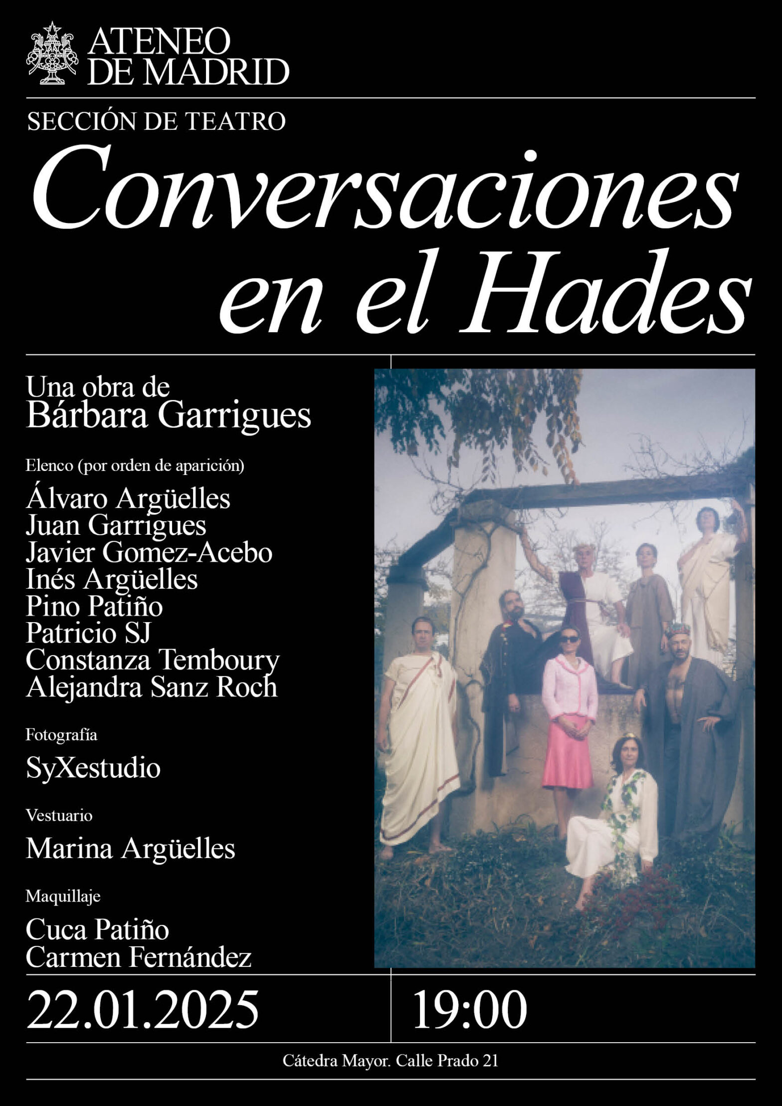 Sección de Teatro. Conversaciones en el Hades. Una obra de Bárbara Garrigues. Elenco (en orden de aparición): Álvaro Argüelles, Juan Garrigues, Javier Gómez-Acebo, Inés Argüelles, Pino Patiño, Patricio SJ, Constanza Temboury y Alejandra Sanz Roch. Fotografía: SyXestudio. Vestuario: Marina Argüelles. Maquillaje: Cuca Patiño y Carmen Fernández. Cátedra Mayor. 19:00h.