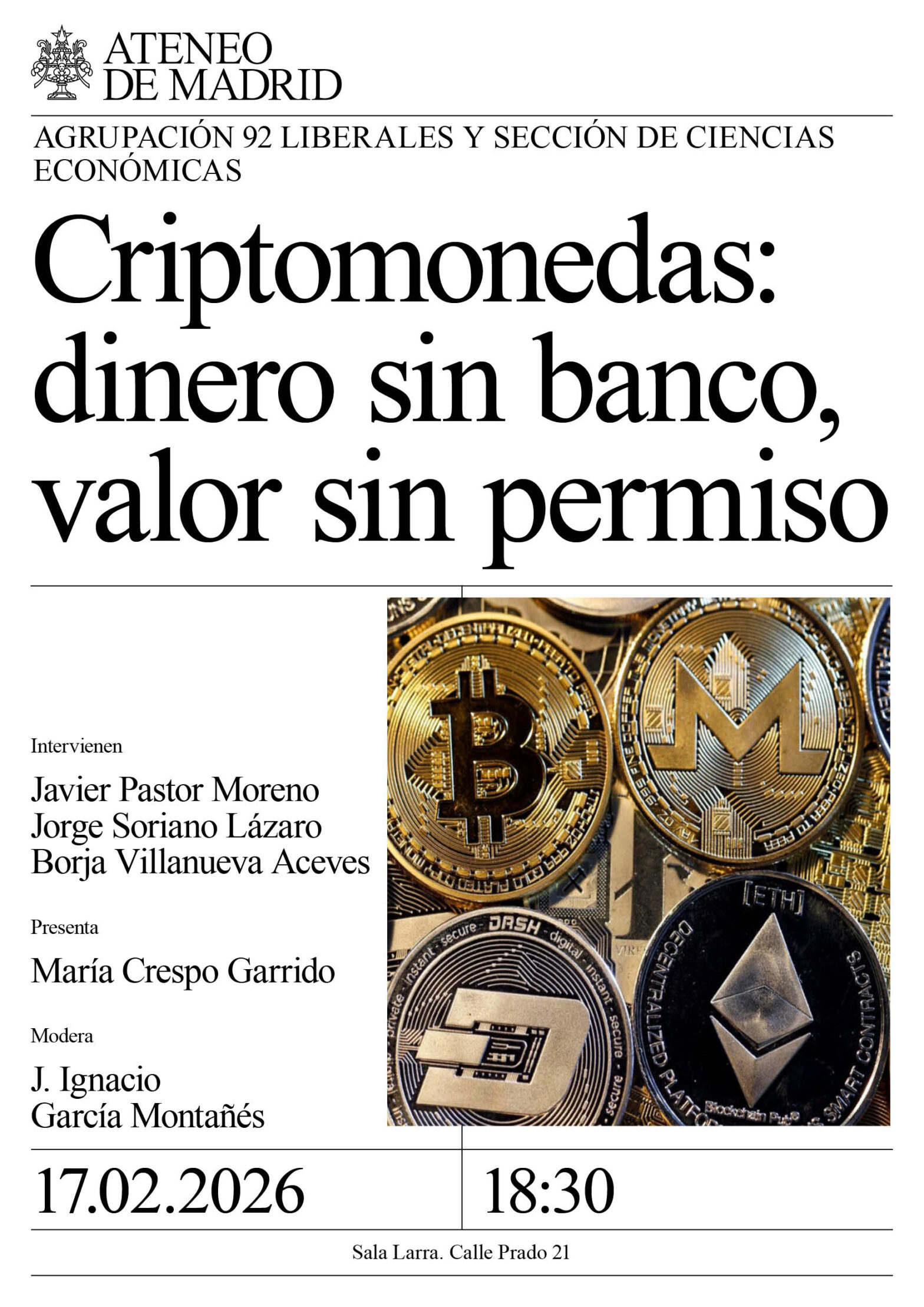 Agrupación 92 Liberales y Sección de Ciencias Económicas. Intervienen: Javier Pastor Moreno, Jorge Soriano Lázaro, Borja Villanueva Aceves. Presenta: María Crespo Garrido. Modera: J. Ignacio García Montañés. Sala Larra. 18:30h.