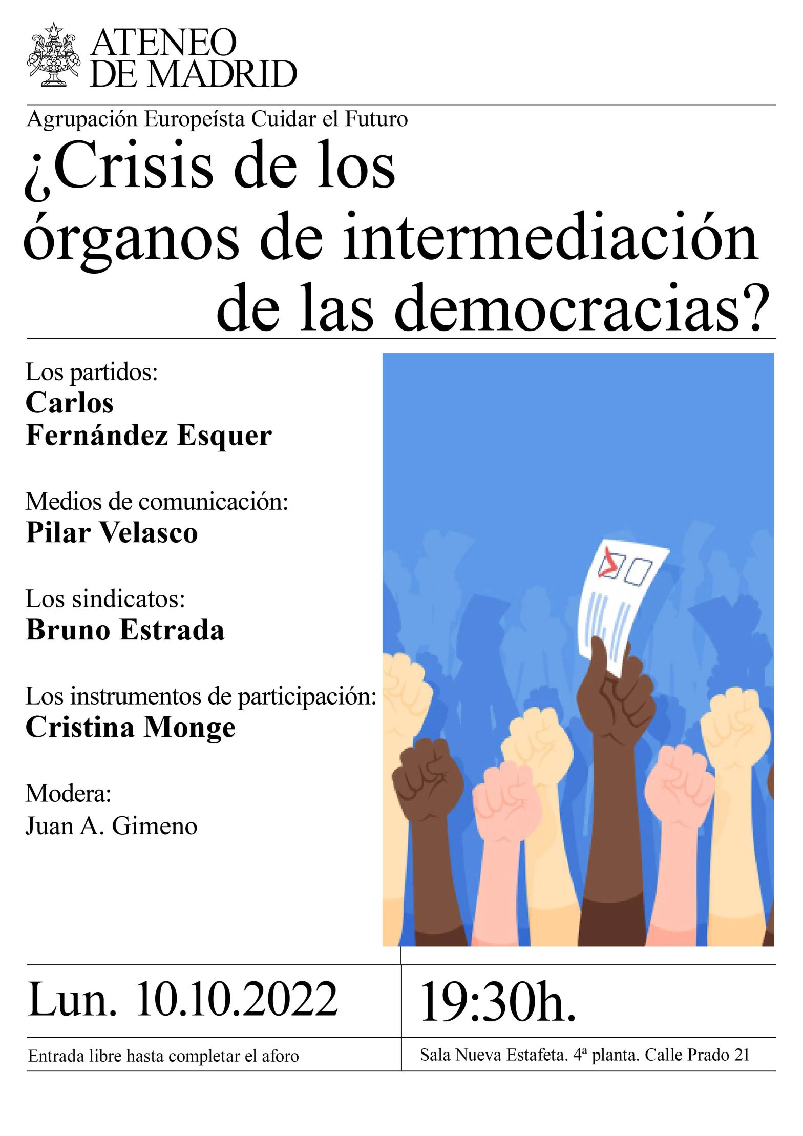 Agrupación Europeísta. Intervienen: Los partidos: Carlos Fernández Escuer. Medios de comunicación: Pilar Velasco. Los sindicatos: Bruno Estrada. Los instrumentos de participación: Cristina Monge. Modera: Juan A. Gimeno. Sala Nueva Estafeta.