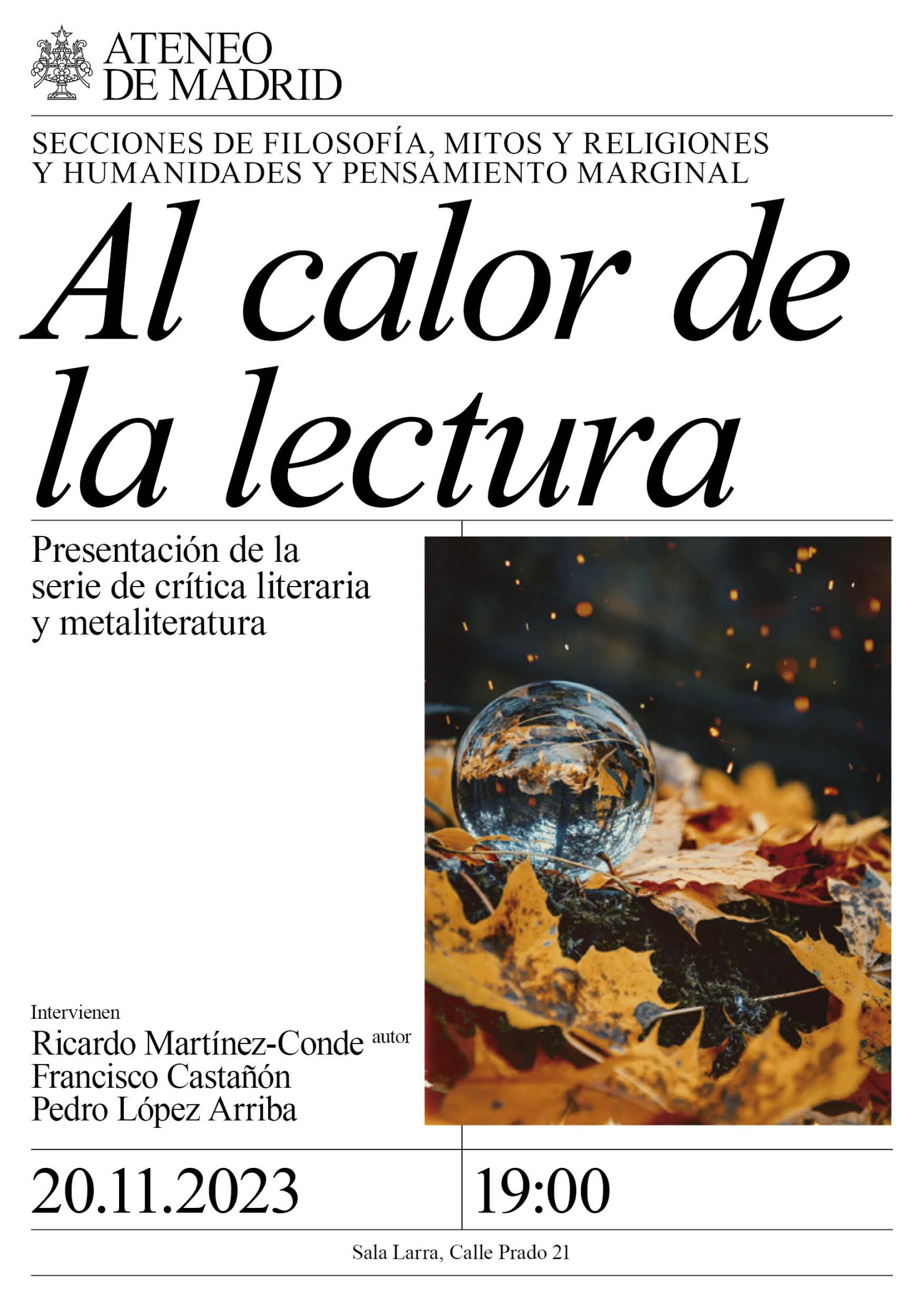 Secciones de Filosofía, Mitos, Religiones y Humanidades y Pensamiento Marginal. Intervienen: Ricardo Martínez-Conde, autor, escritor y ensayista. Francisco Castañón, escritor y fundador de la Revista Entreletras. Pedro López Arriba, redactor de Entreletras. Sala Larra. 19h.