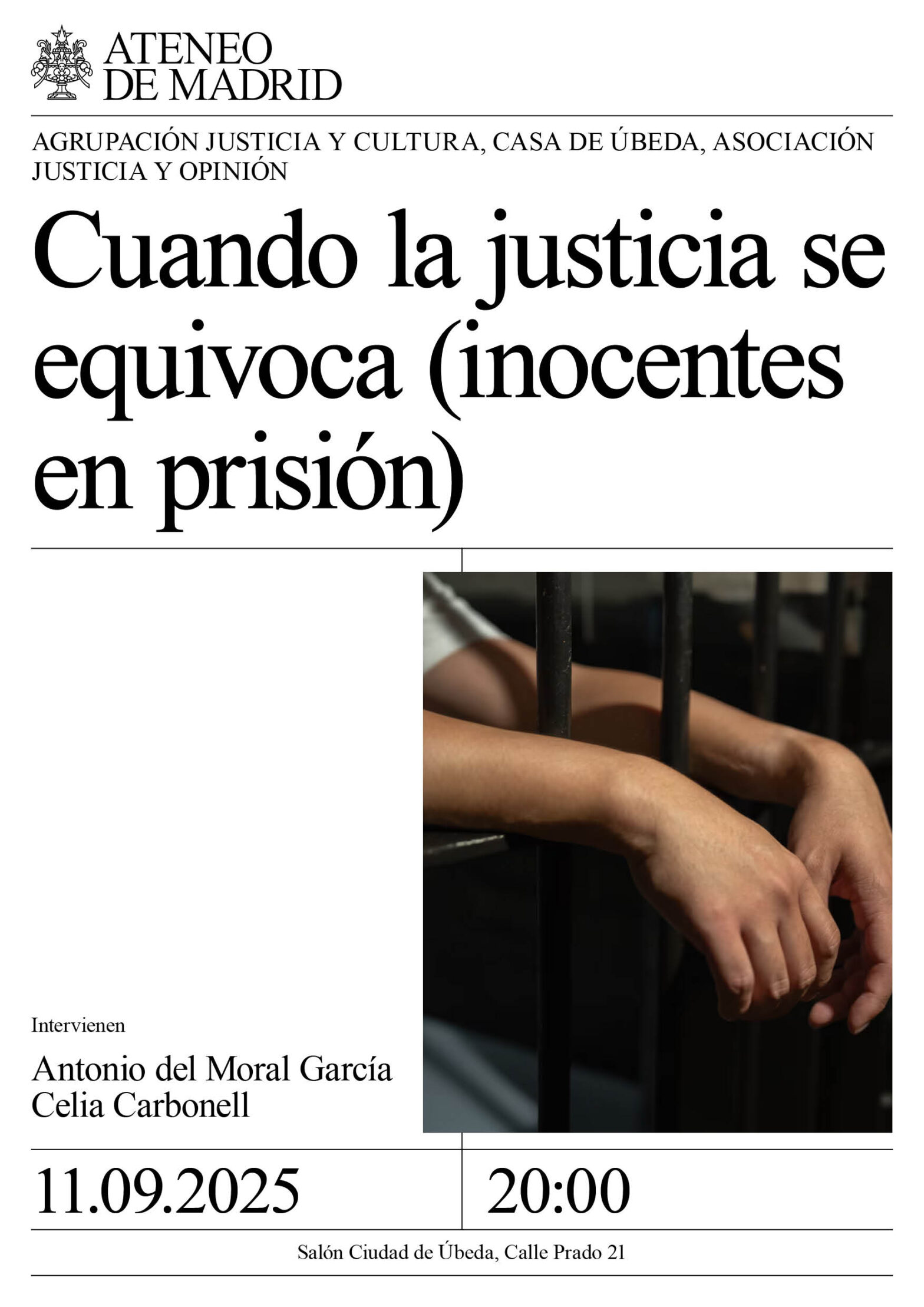 Agrupación Justicia y Cultura, Casa de Úbeda, Asociación Justicia y Opinión. Intervienen: Antonio del Moral García, magistrado de la Sala Segunda (Penal) del Tribunal Supremo y Celia Carbonell, abogada, IX Premio Hay Derecho. Salón Ciudad de Úbeda. 20:00h.