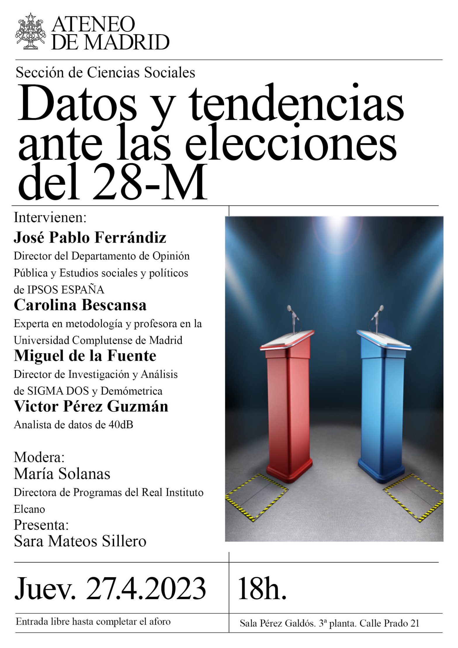Sección de Ciencias Sociales. Intervienen: José Pablo Ferrándiz, director del Departamento de Opinión Pública y Estudios sociales y políticos de IPSOS ESPAÑA; Carolina Bescansa, experta en metodología y profesora en la Universidad Complutense de Madrid; Miguel de la Fuente. director de Investigación y Análisis de SIGMA DOS y Demómetrica; Victor Pérez Guzmán, analista de datos de 40dB. Modera: María Solanas, directora de Programas del Real Instituto Elcano. Presenta: Sara Mateos Sillera. Sala Pérez Galdós. 18h.