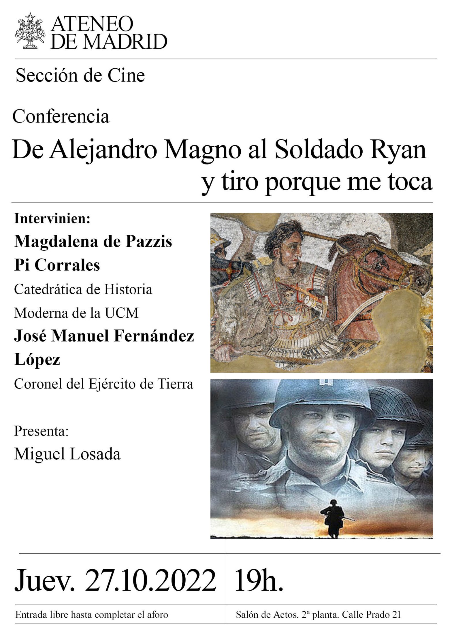 Sección de Cine. Conferencia. De Alejandro Magno al Soldado Ryan y tiro porque me toca. Intervinientes: Magdalena de Pazzis Pi Corrales, catedrática de Historia Moderna de la Universidad Complutense; José Manuel Fernández López, coronel del Ejército de Tierra. Presenta: Miguel Losada. Salón de Actos.